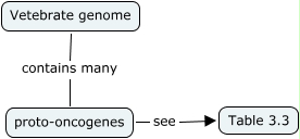 This Concept Map, created with IHMC CmapTools, has information related to: Chapter 3-10, Vetebrate genome contains many proto-oncogenes, proto-oncogenes see Table 3.3