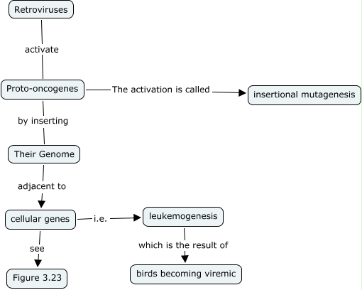 This Concept Map, created with IHMC CmapTools, has information related to: Chapter 3-11, Their Genome adjacent to cellular genes, cellular genes i.e. leukemogenesis, Retroviruses activate Proto-oncogenes, cellular genes see Figure 3.23, leukemogenesis which is the result of birds becoming viremic, Proto-oncogenes by inserting Their Genome, Proto-oncogenes The activation is called insertional mutagenesis