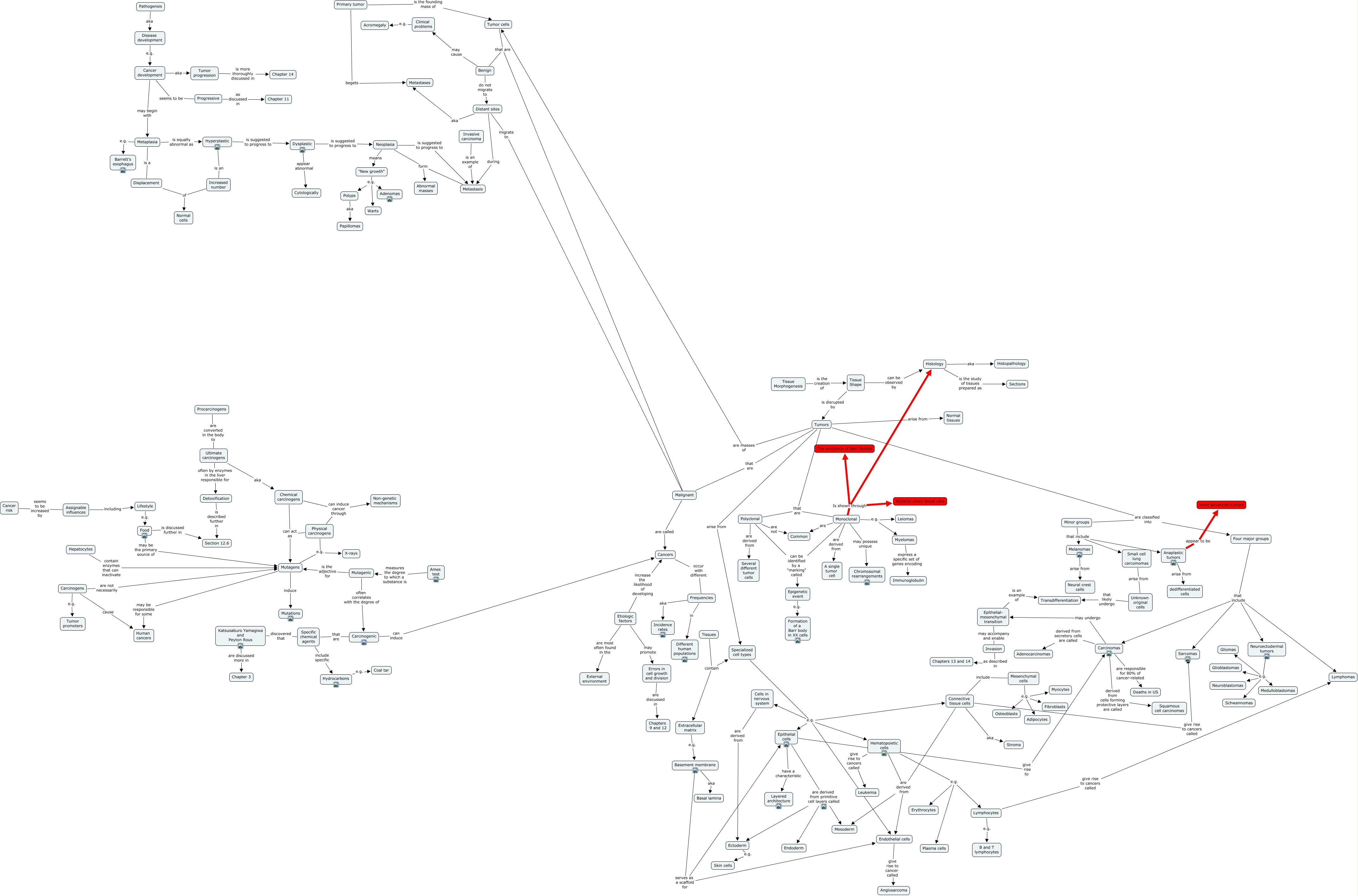 This Concept Map, created with IHMC CmapTools, has information related to: Chapter 2 merge all, Endothelial cells give rise to cancer called Angiosarcoma, Epithelial cells are derived from primitive cell layers called Ectoderm, Distant sites aka Metastases, Tumor cells that are Malignant, Carcinogens cause Human cancers, Specialized cell types e.g. Epithelial cells, Monoclonal are Common, Benign may cause Clinical problems, Carcinomas derived from secretory cells are called Adenocarcinomas, Myelomas express a specific set of genes encoding Immunoglobulin, Carcinogens are not necessarily Mutagens, Anaplastic tumors appear to be more advanced tumors, Specialized cell types e.g. Cells in nervous system, Connective tissue cells are derived from Mesoderm, Pathogensis aka Disease development, Monoclonal Is shown through Histology, Polyclonal are derived from Several different tumor cells, Epithelial- mesenchymal transition may accompany and enable Invasion, Extracellular matrix e.g. Basement membrane, Minor groups that include Melanomas