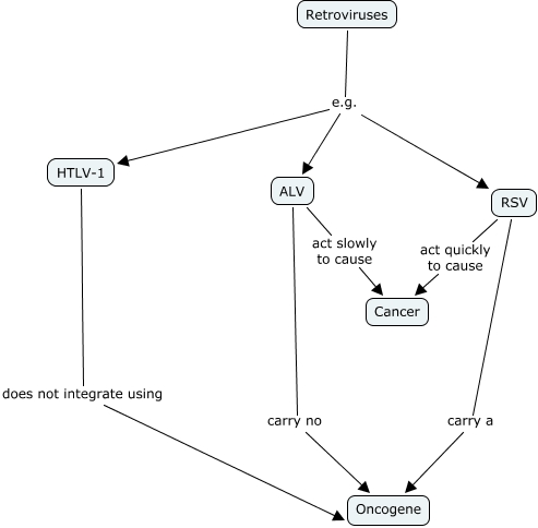 This Concept Map, created with IHMC CmapTools, has information related to: 3.12, Retroviruses e.g. HTLV-1, RSV act quickly to cause Cancer, RSV carry a Oncogene, ALV act slowly to cause Cancer, ALV carry no Oncogene, Retroviruses e.g. ALV, HTLV-1 does not integrate using Oncogene, Retroviruses e.g. RSV