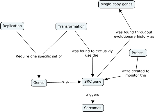 This Concept Map, created with IHMC CmapTools, has information related to: 3.8, Transformation was found to exclusivly use the SRC gene, Probes were created to monitor the SRC gene, Replication Require one specific set of Genes, SRC gene triggers Sarcomas, Transformation Require one specific set of Genes, SRC gene was found througout evolutionary history as single-copy genes, Genes e.g. SRC gene