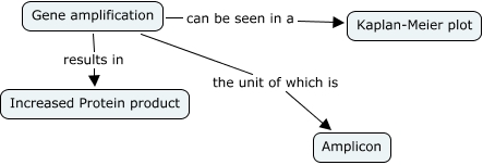 This Concept Map, created with IHMC CmapTools, has information related to: Chapter 4-3, Gene amplification can be seen in a Kaplan-Meier plot, Gene amplification results in Increased Protein product, Gene amplification the unit of which is Amplicon
