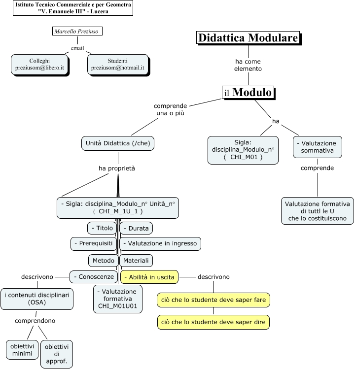 This Concept Map, created with IHMC CmapTools, has information related to: La Programmazione Modulare, Unità Didattica (/che) ha proprietà - Durata, Unità Didattica (/che) ha proprietà - Valutazione formativa CHI_M01U01, - Valutazione sommativa comprende Valutazione formativa di tuttl le U che lo costituiscono, Unità Didattica (/che) ha proprietà - Abilità in uscita, - Conoscenze descrivono i contenuti disciplinari (OSA), Unità Didattica (/che) ha proprietà - Prerequisiti, - Abilità in uscita descrivono ciò che lo studente deve saper dire, il Modulo ha Sigla: disciplina_Modulo_n° ( CHI_M01 ), Unità Didattica (/che) ha proprietà - Valutazione in ingresso, Unità Didattica (/che) ha proprietà - Sigla: disciplina_Modulo_n° Unità_n° ( CHI_M_1U_1 ), i contenuti disciplinari (OSA) comprendono obiettivi minimi, i contenuti disciplinari (OSA) comprendono obiettivi di approf., il Modulo comprende una o più Unità Didattica (/che), - Abilità in uscita descrivono ciò che lo studente deve saper fare, Marcello Preziuso email Studenti preziusom@hotmail.it, il Modulo ha - Valutazione sommativa, Unità Didattica (/che) ha proprietà - Abilità in uscita, Unità Didattica (/che) ha proprietà - Conoscenze, Marcello Preziuso email Colleghi preziusom@libero.it, Didattica Modulare ha come elemento il Modulo