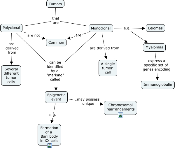 This Concept Map, created with IHMC CmapTools, has information related to: Chapter 2-5 partial map, Polyclonal can be identified by a "marking" called Epigenetic event, Monoclonal can be identified by a "marking" called Epigenetic event, Monoclonal e.g. Leiomas, Epigenetic event may possess unique Chromosomal rearrangements, Tumors that are Polyclonal, Polyclonal are derived from Several different tumor cells, Monoclonal e.g. Myelomas, Myelomas express a specific set of genes encoding Immunoglobulin, Monoclonal are derived from A single tumor cell, Polyclonal are not Common, Tumors that are Monoclonal, Epigenetic event e.g. Formation of a Barr body in XX cells, Monoclonal are Common