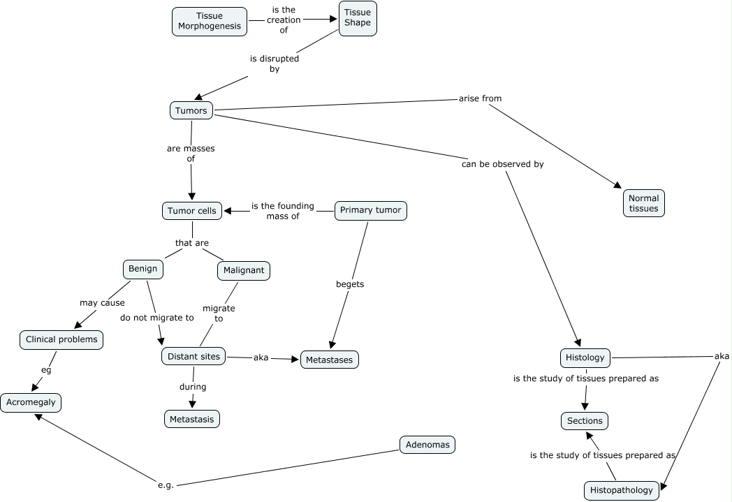 This Concept Map, created with IHMC CmapTools, has information related to: Chapter 2-1 partial map, Benign do not migrate to Distant sites, Tissue Shape is disrupted by Tumors, Tumors arise from Normal tissues, Distant sites during Metastasis, Tumor cells that are Benign, Clinical problems eg Acromegaly, Tumor cells that are Malignant, Histopathology is the study of tissues prepared as Sections, Tumors are masses of Tumor cells, Tissue Morphogenesis is the creation of Tissue Shape, Adenomas e.g. Acromegaly, Distant sites aka Metastases, Tumors can be observed by Histology, Histology aka Histopathology, Malignant migrate to Distant sites, Benign may cause Clinical problems, Primary tumor is the founding mass of Tumor cells, Histology is the study of tissues prepared as Sections, Primary tumor begets Metastases
