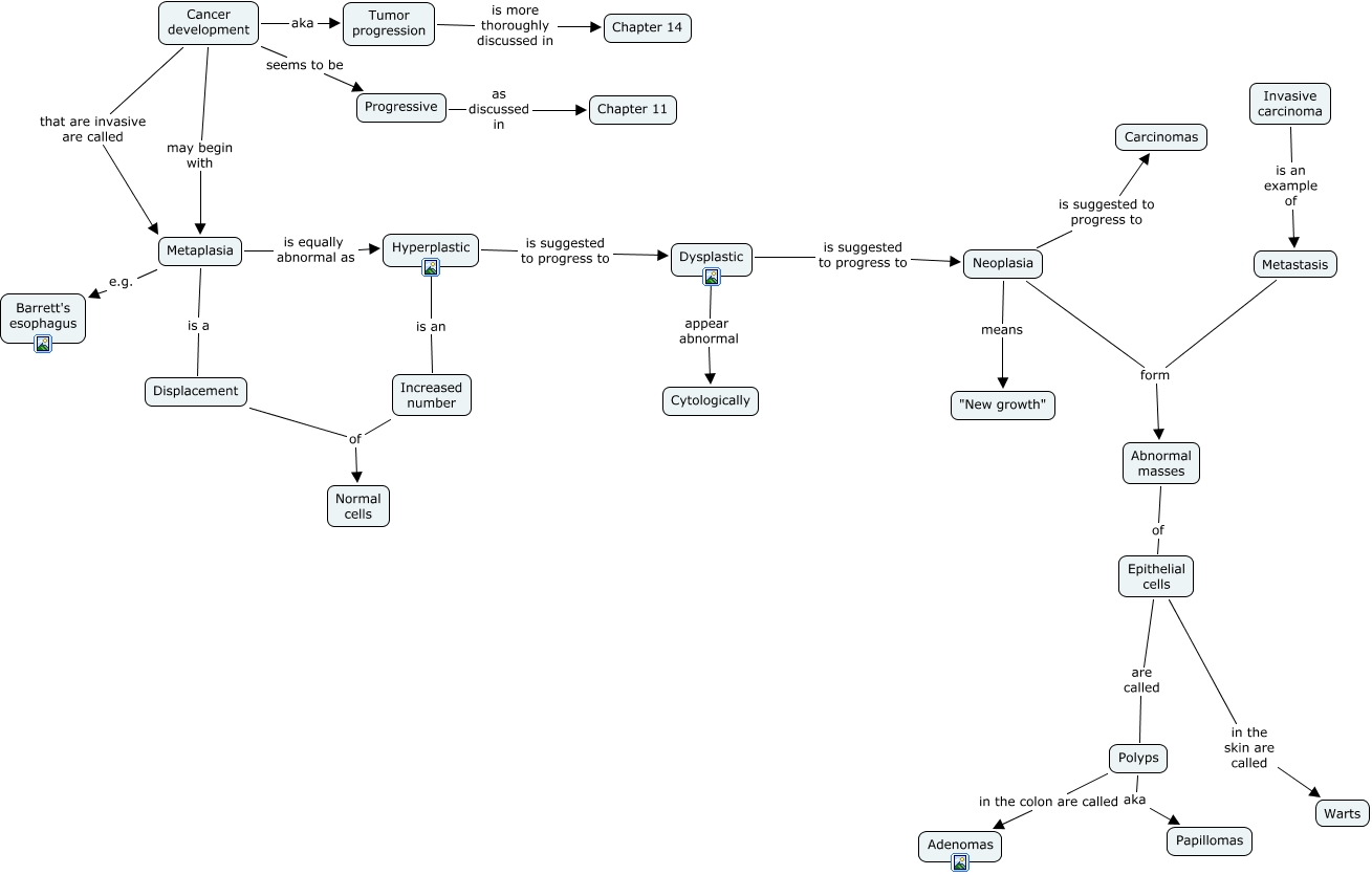 This Concept Map, created with IHMC CmapTools, has information related to: Chapter 2-4 partial map, Tumor progression is more thoroughly discussed in Chapter 14, Dysplastic appear abnormal Cytologically, Metastasis form Abnormal masses, Hyperplastic is suggested to progress to Dysplastic, Progressive as discussed in Chapter 11, Epithelial cells are called Polyps, Metaplasia e.g. Barrett's esophagus, Neoplasia means "New growth", Cancer development that are invasive are called Metaplasia, Neoplasia is suggested to progress to Carcinomas, Cancer development seems to be Progressive, Hyperplastic is an Increased number, Metaplasia is equally abnormal as Hyperplastic, Increased number of Normal cells, Cancer development aka Tumor progression, Polyps in the colon are called Adenomas, Epithelial cells in the skin are called Warts, Neoplasia form Abnormal masses, Abnormal masses of Epithelial cells, Cancer development may begin with Metaplasia