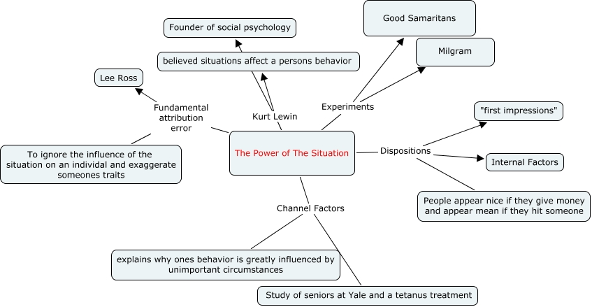 This Concept Map, created with IHMC CmapTools, has information related to: Situation, The Power of The Situation Kurt Lewin Founder of social psychology, The Power of The Situation Experiments Good Samaritans, The Power of The Situation Dispositions People appear nice if they give money and appear mean if they hit someone, The Power of The Situation Dispositions Internal Factors, The Power of The Situation Channel Factors Study of seniors at Yale and a tetanus treatment, The Power of The Situation Experiments Milgram, The Power of The Situation Fundamental attribution error Lee Ross, The Power of The Situation Fundamental attribution error To ignore the influence of the situation on an individal and exaggerate someones traits, The Power of The Situation Channel Factors explains why ones behavior is greatly influenced by unimportant circumstances, The Power of The Situation Dispositions "first impressions", The Power of The Situation Kurt Lewin believed situations affect a persons behavior