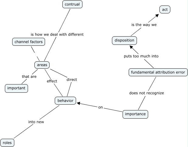 This Concept Map, created with IHMC CmapTools, has information related to: Situation, contrual is how we deal with different areas, fundamental attribution error puts too much into disposition, areas that are important, behavior into new roles, disposition is the way we act, areas effect behavior, channel factors areas, fundamental attribution error does not recognize importance, areas direct behavior, importance on behavior