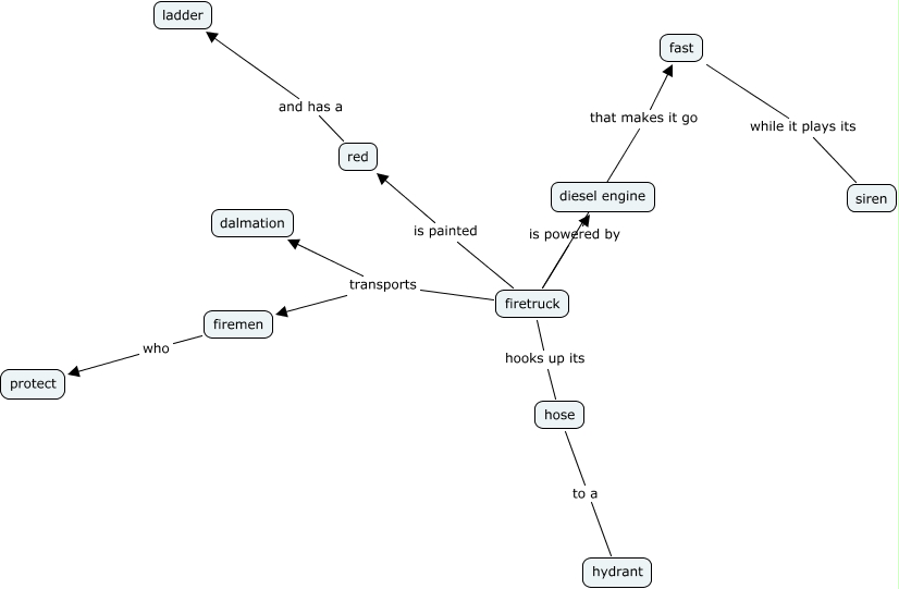 This Concept Map, created with IHMC CmapTools, has information related to: Firetruck, firetruck transports firemen, firemen who protect, firetruck hooks up its hose, firetruck is painted red, red and has a ladder, firetruck transports dalmation, fast while it plays its siren, hose to a hydrant, firetruck is powered by diesel engine, firetruck that makes it go fast