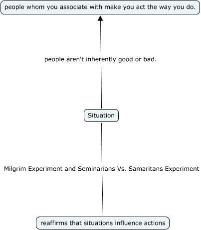 This Concept Map, created with IHMC CmapTools, has information related to: Situation, Situation Milgrim Experiment and Seminarians Vs. Samaritans Experiment reaffirms that situations influence actions, Situation people aren't inherently good or bad. people whom you associate with make you act the way you do.