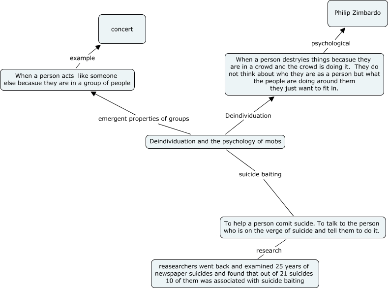 This Concept Map, created with IHMC CmapTools, has information related to: Deindividuation, When a person acts like someone else becasue they are in a group of people example concert, Deindividuation and the psychology of mobs Deindividuation When a person destryies things becasue they are in a crowd and the crowd is doing it. They do not think about who they are as a person but what the people are doing around them they just want to fit in., Deindividuation and the psychology of mobs emergent properties of groups When a person acts like someone else becasue they are in a group of people, When a person destryies things becasue they are in a crowd and the crowd is doing it. They do not think about who they are as a person but what the people are doing around them they just want to fit in. psychological Philip Zimbardo, To help a person comit sucide. To talk to the person who is on the verge of suicide and tell them to do it. research reasearchers went back and examined 25 years of newspaper suicides and found that out of 21 suicides 10 of them was associated with suicide baiting, Deindividuation and the psychology of mobs suicide baiting To help a person comit sucide. To talk to the person who is on the verge of suicide and tell them to do it.