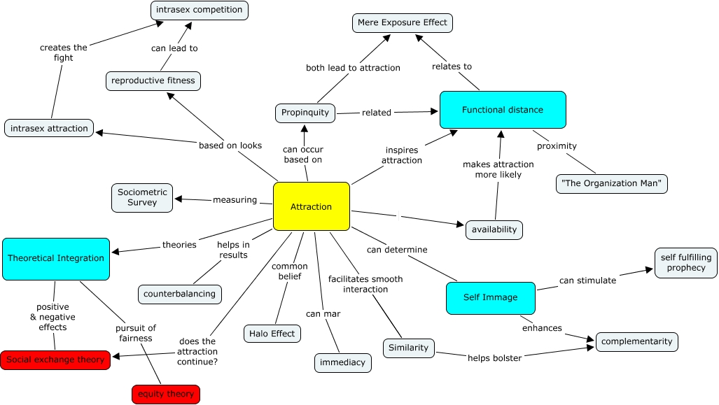 This Concept Map, created with IHMC CmapTools, has information related to: Chapter 3, Attraction availability, Similarity helps bolster complementarity, Theoretical Integration pursuit of fairness equity theory, Attraction based on looks reproductive fitness, Self Immage enhances complementarity, Theoretical Integration positive & negative effects Social exchange theory, Attraction theories Theoretical Integration, Propinquity related Functional distance, Attraction facilitates smooth interaction Similarity, Self Immage can stimulate self fulfilling prophecy, Attraction can mar immediacy, Attraction can determine Self Immage, Attraction can occur based on Propinquity, Attraction does the attraction continue? Social exchange theory, availability makes attraction more likely Functional distance, Attraction facilitates smooth interaction Similarity, reproductive fitness can lead to intrasex competition, Attraction based on looks intrasex attraction, Attraction measuring Sociometric Survey, Functional distance proximity "The Organization Man"