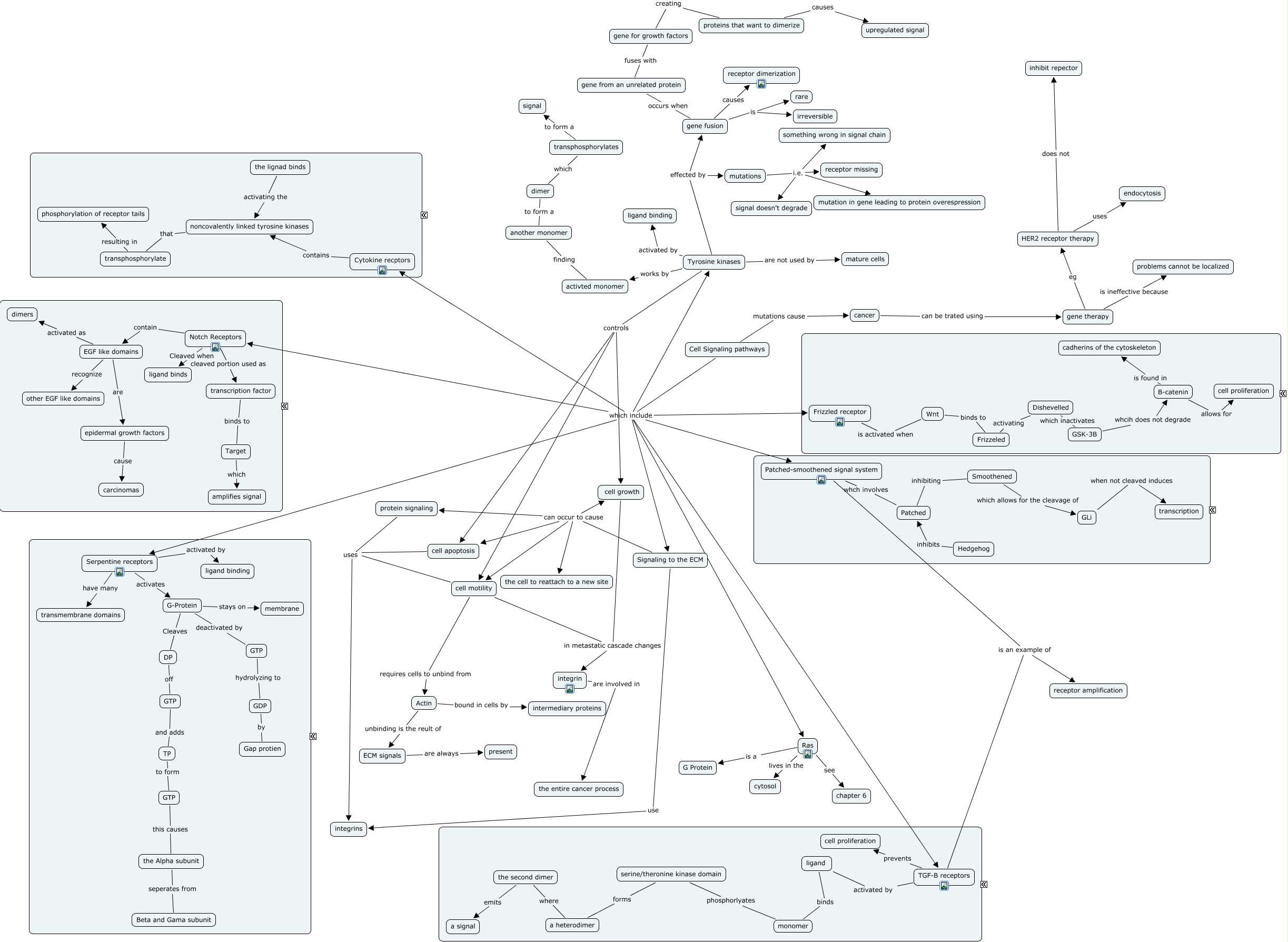 This Concept Map has information related to: Class Notes 9.10&9.13 Chapter 5 growth factors&receptors, protein signaling uses integrins, gene fusion is irreversible, HER2 receptor therapy does not inhibit repector, the lignad binds activating the noncovalently linked tyrosine kinases, Notch Receptors Cleaved when ligand binds, noncovalently linked tyrosine kinases that transphosphorylate, transphosphorylate resulting in phosphorylation of receptor tails, epidermal growth factors cause carcinomas, serine/theronine kinase domain forms a heterodimer, TGF-B receptors is an example of receptor amplification