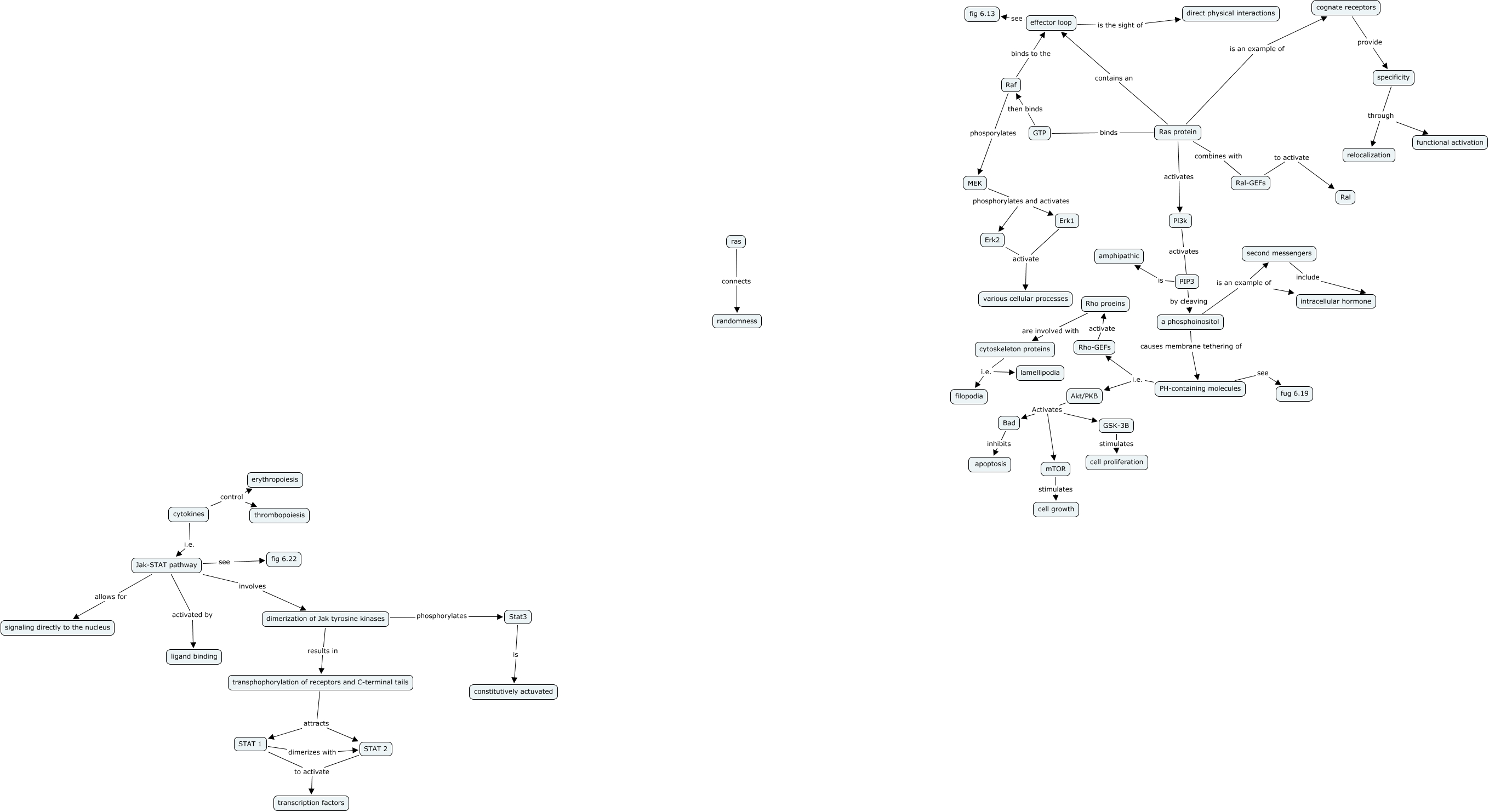 This Concept Map, created with IHMC CmapTools, has information related to: 5.5-5.8, effector loop see fig 6.13, GTP then binds Raf, cytokines control thrombopoiesis, PIP3 by cleaving a phosphoinositol, MEK phosphorylates and activates Erk2, Rho-GEFs activate Rho proeins, cytoskeleton proteins i.e. lamellipodia, MEK phosphorylates and activates Erk1, Stat3 is constitutively actuvated, Bad inhibits apoptosis, dimerization of Jak tyrosine kinases phosphorylates Stat3, specificity through functional activation, Akt/PKB Activates Bad, Pl3k activates PIP3, STAT 1 to activate transcription factors, a phosphoinositol is an example of second messengers, STAT 2 to activate transcription factors, Jak-STAT pathway involves dimerization of Jak tyrosine kinases, GSK-3B stimulates cell proliferation, mTOR stimulates cell growth