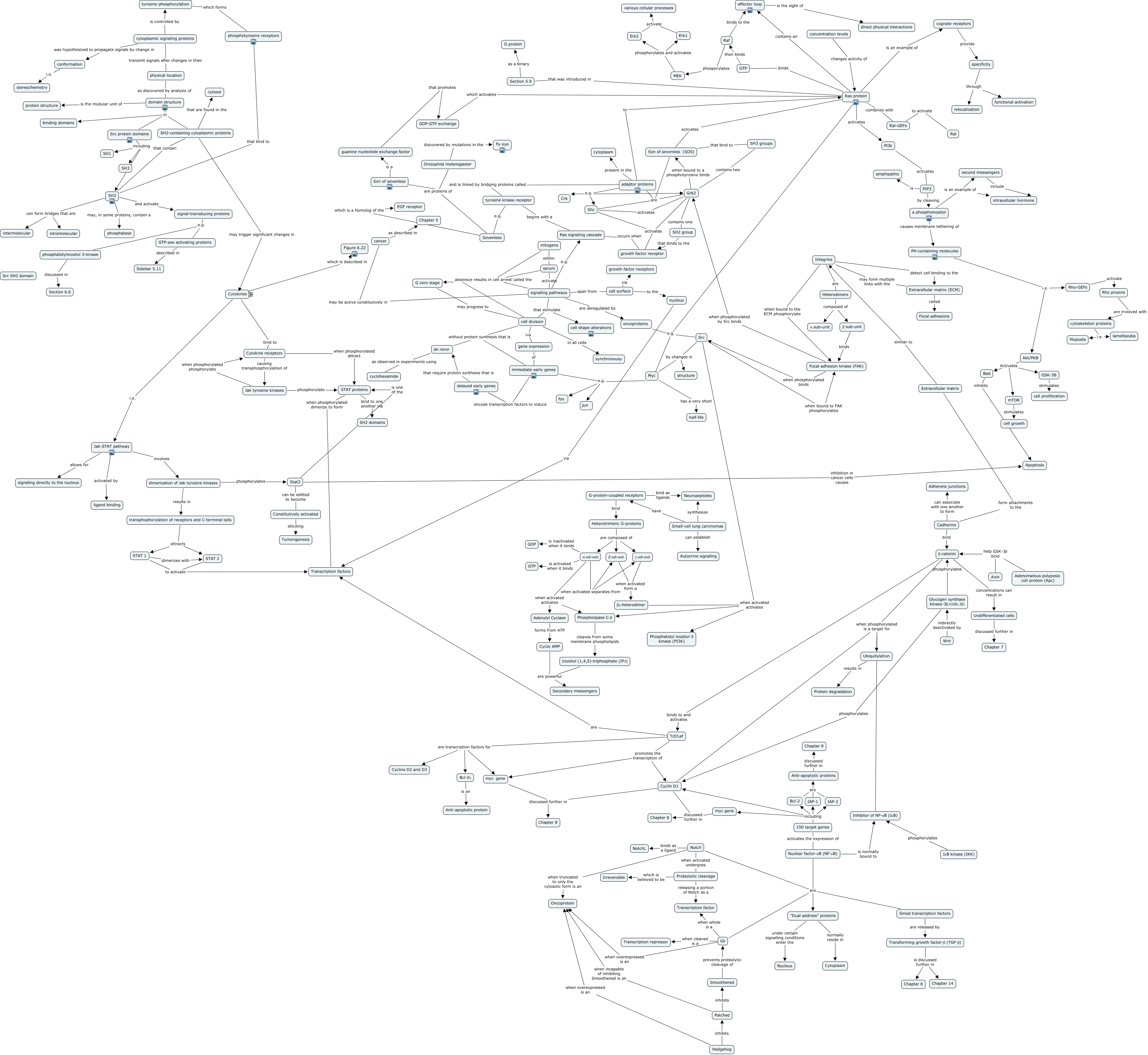 This Concept Map, created with IHMC CmapTools, has information related to: Chapter 6 merged, a phosphoinositol is an example of second messengers, SH2 group that binds to the growth factor receptor, Nuclear factor-κB (NF-κB) is normally bound to Inhibitor of NF-κB (IκB), Inhibitor of NF-κB (IκB) when phosphorylated is a target for Ubiquitylation, Cyclin D1 discussed further in Chapter 8, adaptor proteins e.g. Grb2, immediate early genes without protein synthesis that is de novo, serum activate signaling pathways, α sub-unit when activated separates from β sub-unit, a phosphoinositol causes membrane tethering of PH-containing molecules, cell surface to the nucleus, 150 target genes including IAP-1, Bad inhibits Apoptosis, tyrosine kinase receptor e.g. Sevenless, Grb2 contains one SH2 group, STAT proteins when phosphorylated dimerize to form Transcription factors, Focal adhesion kinase (FAK) when phosphorylated binds Src, Heterotrimeric G-proteins are composed of γ sub-unit, signaling pathways are deregulated by oncoproteins, Ras signaling cascade begins with a tyrosine kinase receptor