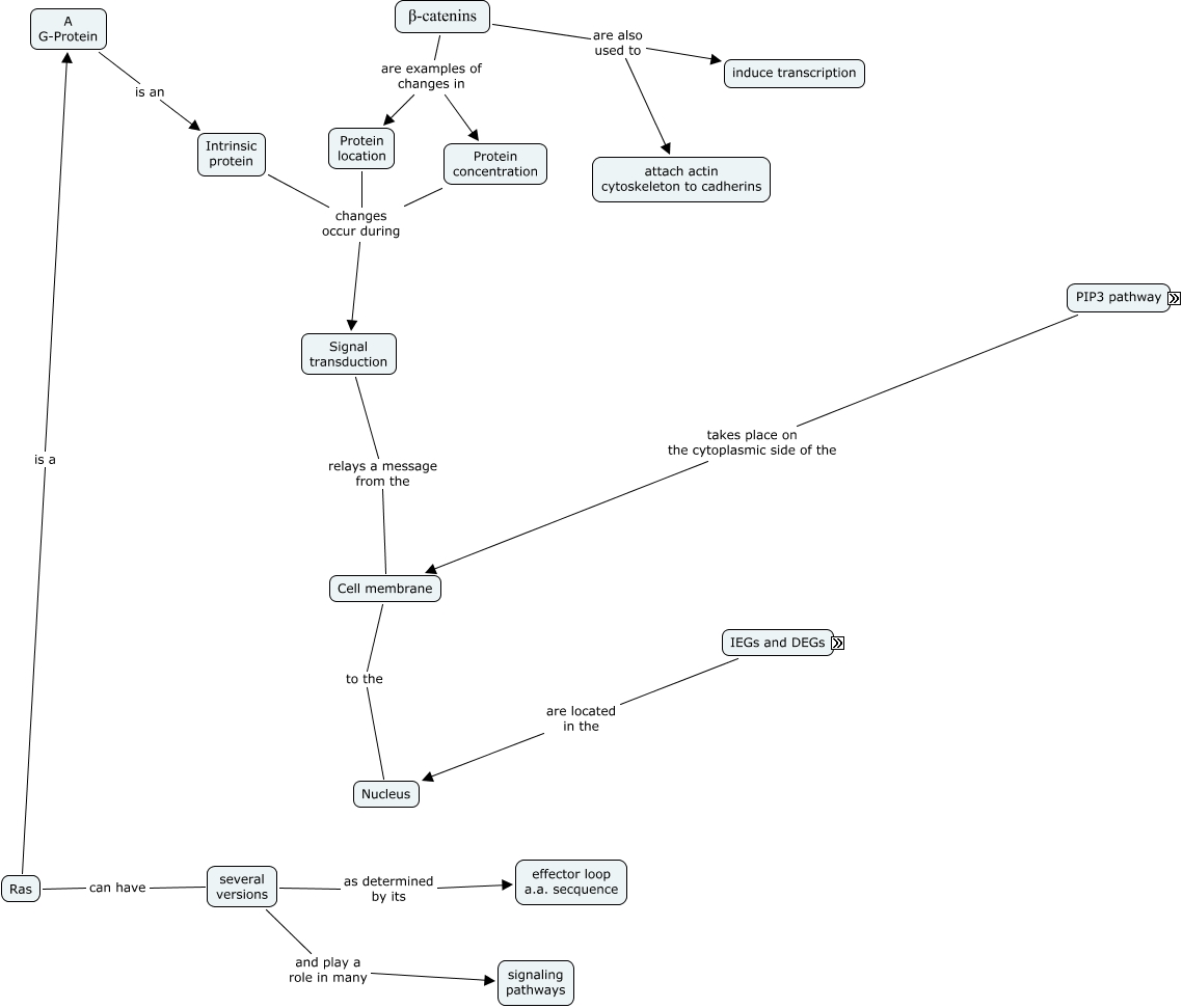 This Concept Map, created with IHMC CmapTools, has information related to: 9.17.07 Chapter 6 class notes, PIP2 can be reformed by PTEN, β-catenins are also used to attach actin cytoskeleton to cadherins, PIP2 can become PIP3, PIP3 pathway takes place on the cytoplasmic side of the Cell membrane, β-catenins are also used to induce transcription, Cell membrane to the Nucleus, PIP2 can be cleaved to form IP3, IP3 via Phospholipase C, β-catenins are examples of changes in Protein concentration, PI can become PIP2, Phospholipase C can bind PIP2, IEGs and DEGs are located in the Nucleus, Signal transduction relays a message from the Cell membrane, β-catenins are examples of changes in Protein location, Protein concentration changes occur during Signal transduction, several versions and play a role in many signaling pathways, Intrinsic protein changes occur during Signal transduction, PIP3 via PI3K, Preexisting transcription factors activate IEGs, PTEN dephosphorylating PIP3
