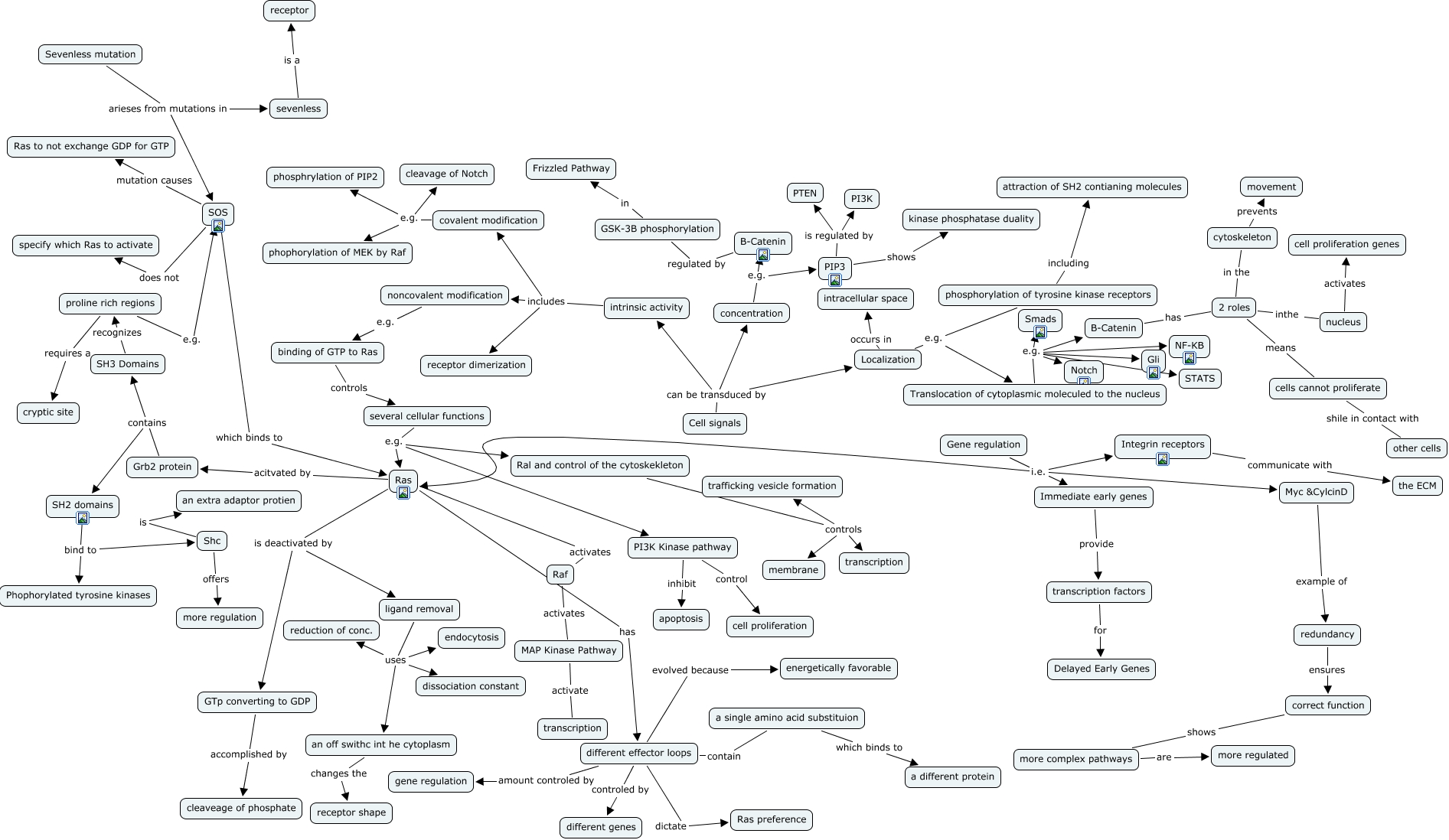 This Concept Map has information related to: Class Notes 9.17&9.20 Chapter6signaling circuitry, phosphorylation of tyrosine kinase receptors including attraction of SH2 contianing molecules, intrinsic activity includes receptor dimerization, covalent modification e.g. phophorylation of MEK by Raf, several cellular functions e.g. Ral and control of the cytoskekleton, 2 roles inthe nucleus, Translocation of cytoplasmic moleculed to the nucleus e.g. Notch, different effector loops dictate Ras preference, PI3K Kinase pathway control cell proliferation, Cell signals can be transduced by intrinsic activity, 2 roles in the cytoskeleton