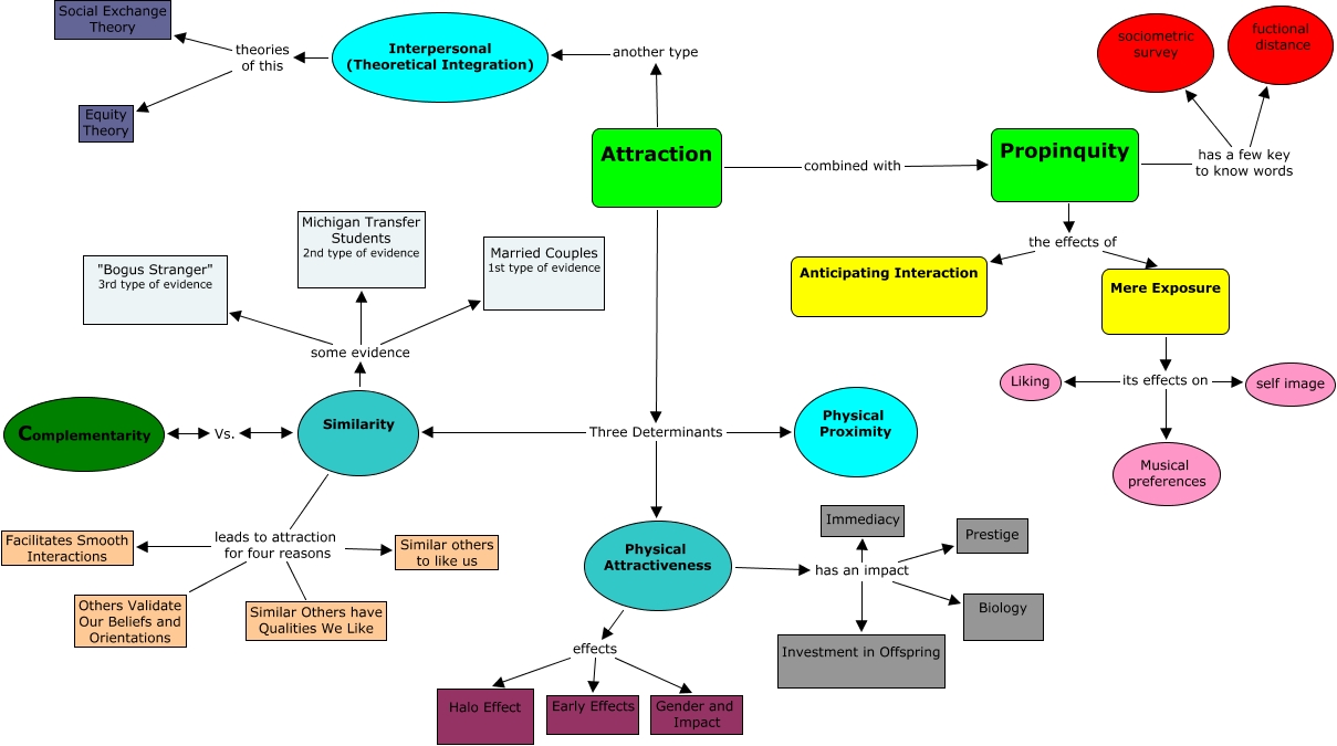 This Concept Map, created with IHMC CmapTools, has information related to: Attraction, Propinquity has a few key to know words fuctional distance, Interpersonal (Theoretical Integration) theories of this Equity Theory, Similarity some evidence "Bogus Stranger" 3rd type of evidence, Physical Attractiveness effects Halo Effect, Physical Attractiveness effects Early Effects, Mere Exposure its effects on self image, Attraction Three Determinants Similarity, Similarity some evidence Married Couples 1st type of evidence, Propinquity the effects of Mere Exposure, Mere Exposure its effects on Liking, Similarity leads to attraction for four reasons Similar others to like us, Attraction combined with Propinquity, Similarity leads to attraction for four reasons Facilitates Smooth Interactions, Physical Attractiveness has an impact Biology, Interpersonal (Theoretical Integration) theories of this Social Exchange Theory, Similarity leads to attraction for four reasons Similar Others have Qualities We Like, Propinquity has a few key to know words sociometric survey, Similarity some evidence Michigan Transfer Students 2nd type of evidence, Physical Attractiveness has an impact Immediacy, Attraction another type Interpersonal (Theoretical Integration)