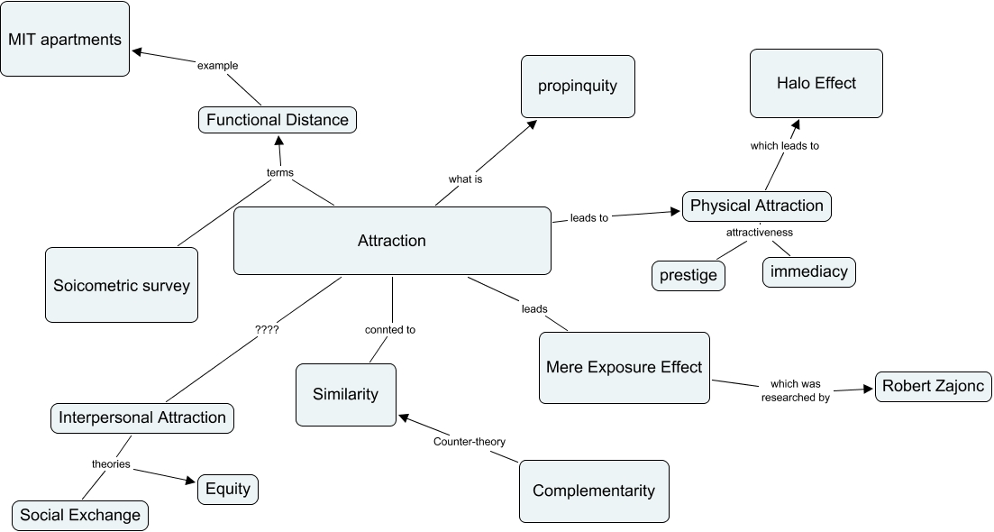 This Concept Map, created with IHMC CmapTools, has information related to: attraction, Mere Exposure Effect which was researched by Robert Zajonc, Attraction leads to Physical Attraction, Functional Distance example MIT apartments, Complementarity Counter-theory Similarity, Physical Attraction which leads to Halo Effect, Attraction terms Functional Distance, Attraction what is propinquity, Physical Attraction attractiveness immediacy, Attraction ???? Interpersonal Attraction, Interpersonal Attraction theories Social Exchange, Interpersonal Attraction theories Equity, Attraction terms Soicometric survey, Attraction connted to Similarity, Physical Attraction attractiveness prestige, Attraction leads Mere Exposure Effect