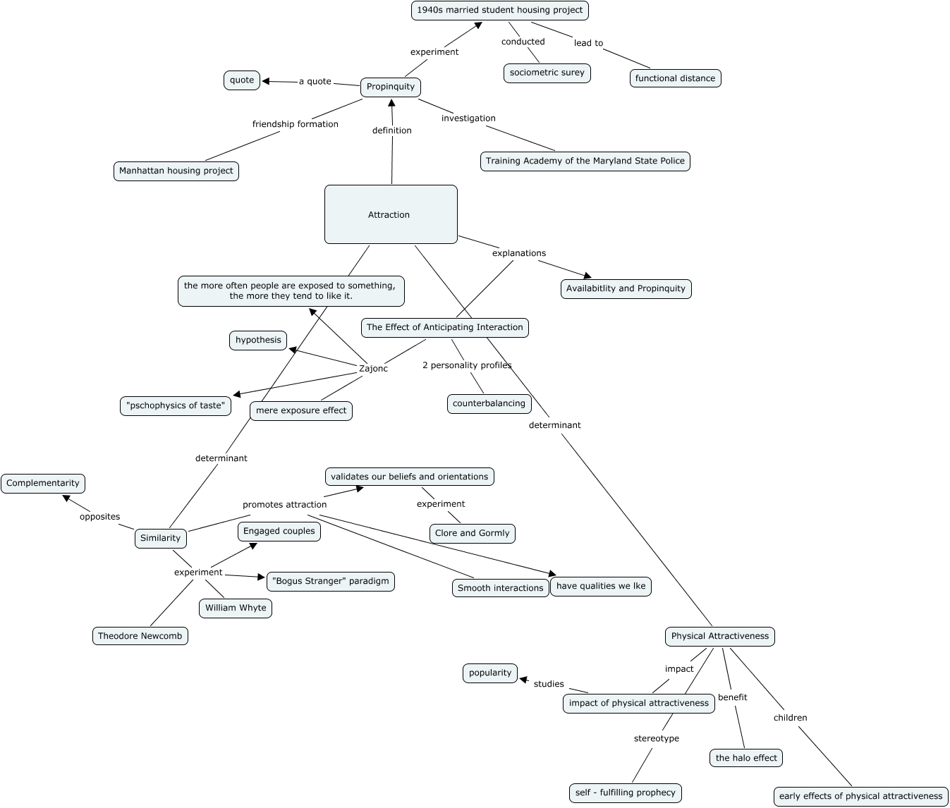 This Concept Map, created with IHMC CmapTools, has information related to: Attraction, Similarity promotes attraction have qualities we lke, Attraction determinant Physical Attractiveness, Attraction determinant Similarity, validates our beliefs and orientations experiment Clore and Gormly, 1940s married student housing project lead to functional distance, Similarity experiment Theodore Newcomb, Similarity promotes attraction Smooth interactions, Attraction explanations The Effect of Anticipating Interaction, The Effect of Anticipating Interaction Zajonc mere exposure effect, Propinquity a quote quote, Similarity experiment Engaged couples, Physical Attractiveness impact impact of physical attractiveness, Physical Attractiveness children early effects of physical attractiveness, The Effect of Anticipating Interaction Zajonc hypothesis, The Effect of Anticipating Interaction Zajonc "pschophysics of taste", Similarity experiment "Bogus Stranger" paradigm, Similarity experiment William Whyte, Attraction explanations Availabitlity and Propinquity, The Effect of Anticipating Interaction Zajonc the more often people are exposed to something, the more they tend to like it., impact of physical attractiveness studies popularity