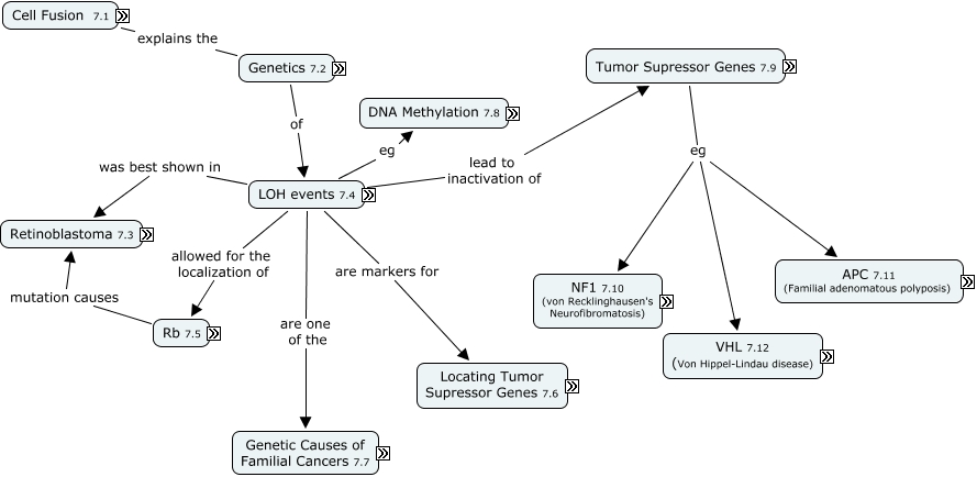 This Concept Map, created with IHMC CmapTools, has information related to: Chapter 7 merged, tumor suppressors eg gatekeepers, Familial adenomatous polyposis (FAP) is caused by mutation in APC, Familial adenomatous polyposis (FAP) leads to formation of Polyps, Genetics of Tumor Supressor Genes, LOH events 7.4 allowed for the localization of Rb 7.5, Polykaryon e.g. heterokaryon, Hyperactivated genes aka Ras Proto-oncogene, Tumor Supressor Genes 7.9 eg VHL 7.12 (Von Hippel-Lindau disease), Ras Signaling is inactivated by Ras GAP, DNA Methylation involves Caretaker Genes, genome maintenance eg caretakers, Recessive Phenotype is supressed in the presence of Dominant Phenotype, Point Mutation can more easily cause Inactivated genes, Cancer cells were though to undergo Gene Shedding, NF1 Gene codes NF1 Protein, Sporadic form required two Allelic Mutation, Neurofibromatosis Type 1 affects 1 in 3500 individuals, LOH events 7.4 lead to inactivation of Tumor Supressor Genes 7.9, HIF-1 during normoxia, Inactivated thorugh LOH