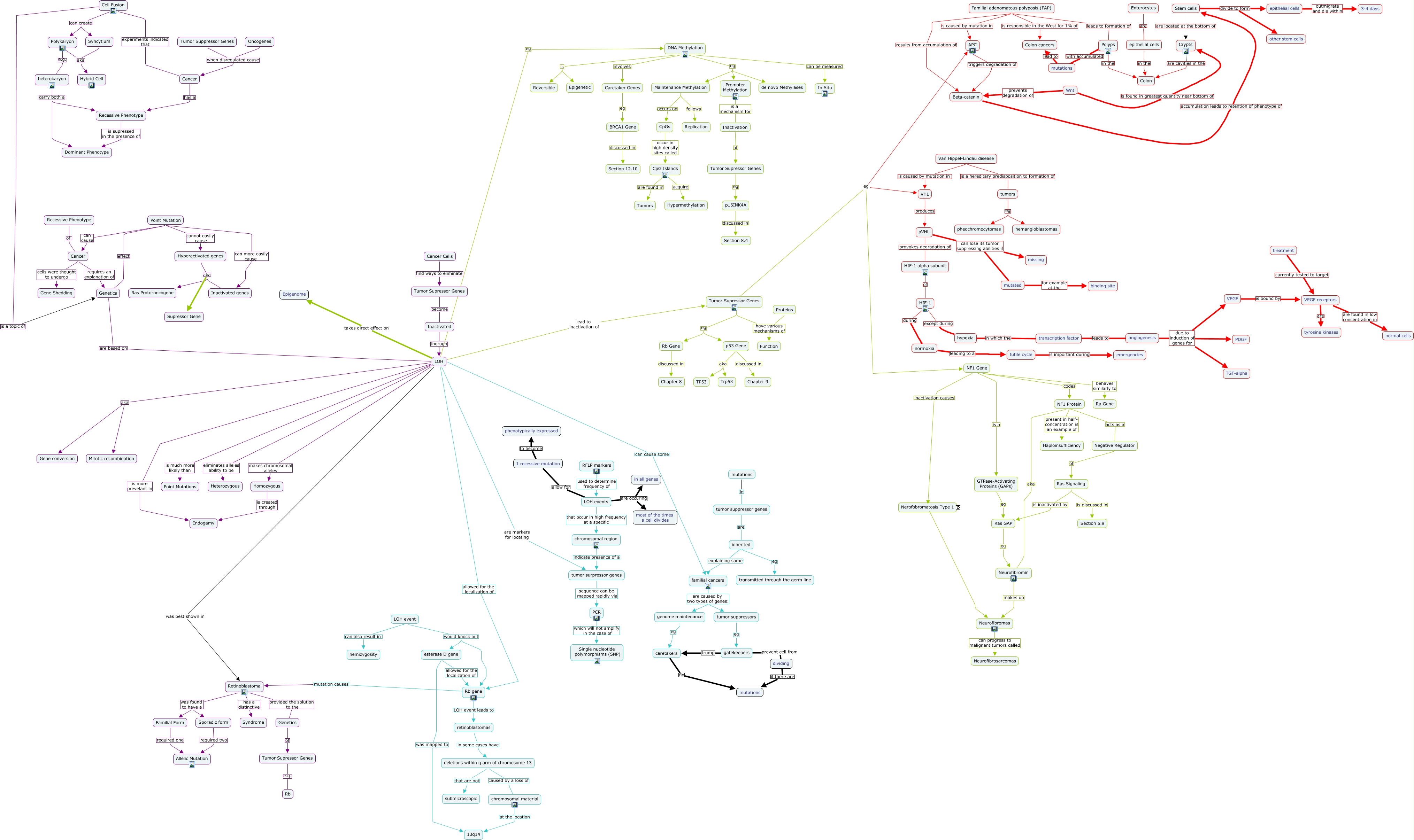 This Concept Map, created with IHMC CmapTools, has information related to: Modified Chapter 7, p53 Gene aka TP53, 1 recessive mutation to become phenotypically expressed, Cancer has a Recessive Phenotype, Cancer requires an explanation of Genetics, APC triggers degradation of Beta-catenin, Cell Fusion can create Polykaryon, Caretaker Genes eg BRCA1 Gene, DNA Methylation is Epigenetic, esterase D gene was mapped to 13q14, dividing if there are mutations, Tumor Supressor Genes eg p16INK4A, Familial adenomatous polyposis (FAP) results from accumulation of Beta-catenin, Tumor Supressor Genes eg NF1 Gene, heterokaryon carry both a Recessive Phenotype, NF1 Gene inactivation causes Neurofibromatosis Type 1, Homozygous is created through Endogamy, angiogenesis due to induction of genes for PDGF, LOH eliminates alleles ability to be Heterozygous, LOH event would knock out Rb gene, HIF-1 during normoxia