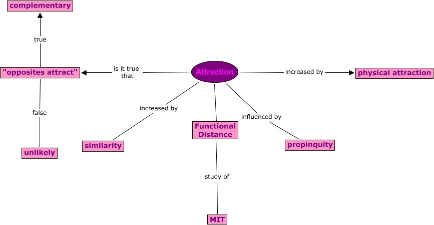 This Concept Map, created with IHMC CmapTools, has information related to: Attraction, Attraction Study Functional Distance, Attraction influenced by propinquity, Attraction increased by similarity, Attraction increased by physical attraction, "opposites attract" false unlikely, Functional Distance study of MIT, "opposites attract" true complementary, Attraction is it true that "opposites attract"
