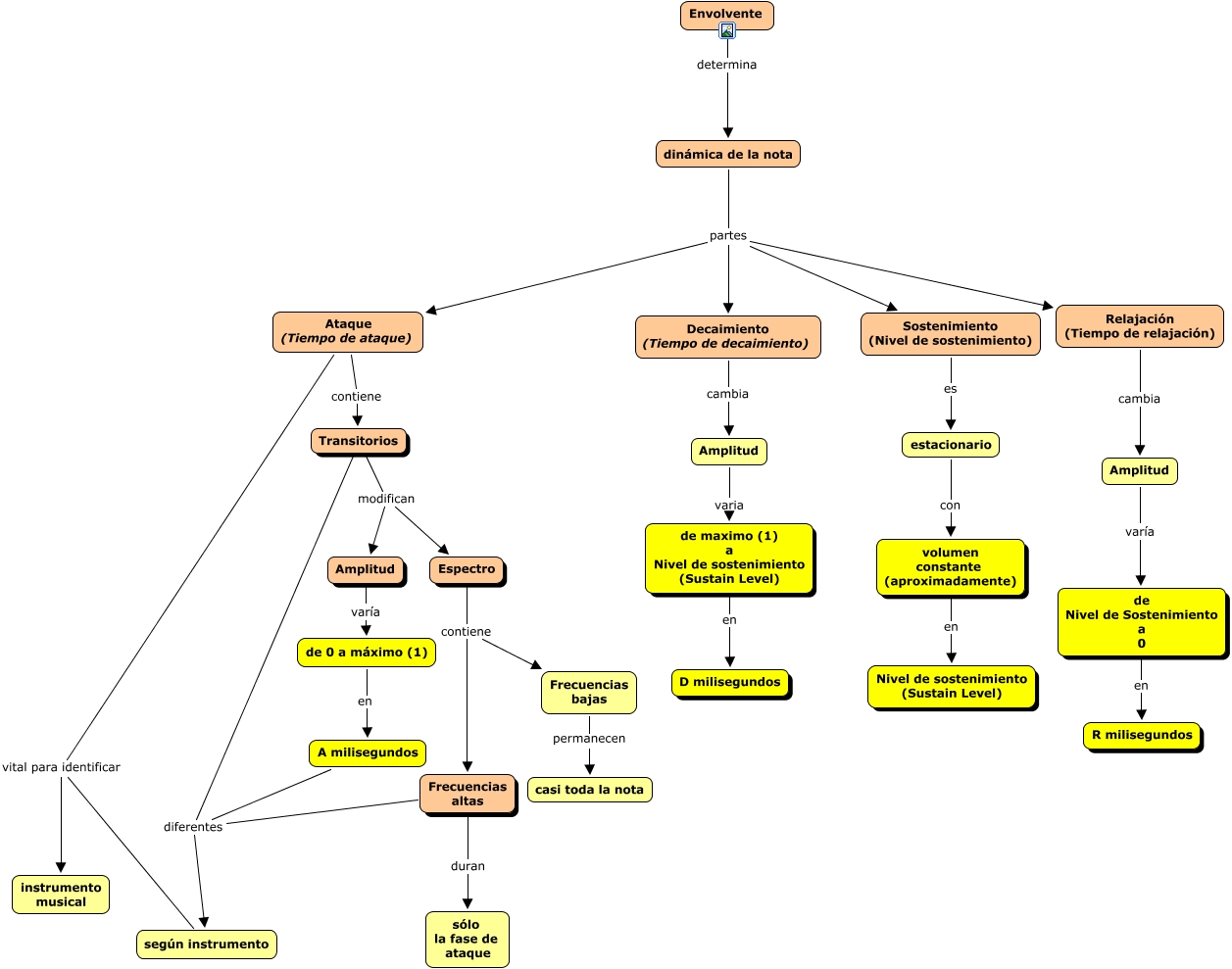 This Concept Map, created with IHMC CmapTools, has information related to: MAPA 2B 2- Envolvente, según instrumento vital para identificar instrumento musical, Frecuencias altas duran sólo la fase de ataque, Espectro contiene Frecuencias altas, de Nivel de Sostenimiento a 0 en R milisegundos, dinámica de la nota partes Relajación (Tiempo de relajación), Ataque (Tiempo de ataque) contiene Transitorios, A milisegundos diferentes según instrumento, Amplitud varía de Nivel de Sostenimiento a 0, Decaimiento (Tiempo de decaimiento) cambia Amplitud, Frecuencias bajas permanecen casi toda la nota, Amplitud varía de 0 a máximo (1), Transitorios diferentes según instrumento, Frecuencias altas diferentes según instrumento, Amplitud varia de maximo (1) a Nivel de sostenimiento (Sustain Level), de 0 a máximo (1) en A milisegundos, estacionario con volumen constante (aproximadamente), de maximo (1) a Nivel de sostenimiento (Sustain Level) en D milisegundos, Espectro contiene Frecuencias bajas, Relajación (Tiempo de relajación) cambia Amplitud, volumen constante (aproximadamente) en Nivel de sostenimiento (Sustain Level)