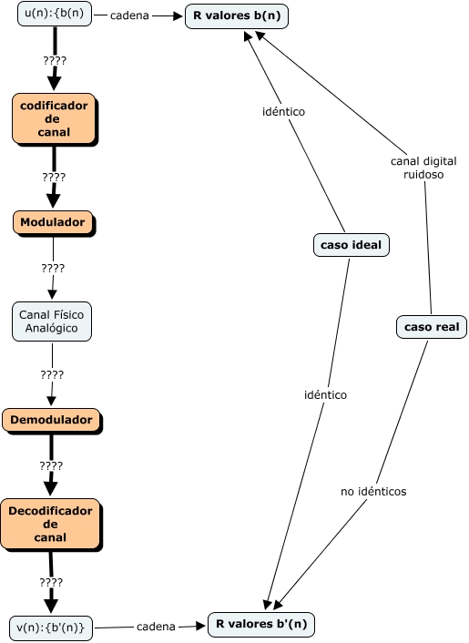 This Concept Map, created with IHMC CmapTools, has information related to: MAPA SCD Canal Digital, caso ideal idéntico R valores b'(n), Canal Físico Analógico ???? Demodulador, caso real canal digital ruidoso R valores b(n), v(n):{b'(n)} cadena R valores b'(n), Decodificador de canal ???? v(n):{b'(n)}, u(n):{b(n) ???? codificador de canal, u(n):{b(n) cadena R valores b(n), Demodulador ???? Decodificador de canal, caso ideal idéntico R valores b(n), Modulador ???? Canal Físico Analógico, caso real no idénticos R valores b'(n), codificador de canal ???? Modulador