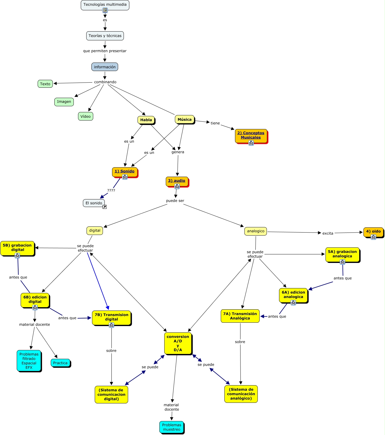 Este Cmap, tiene información relacionada con: MAPA 0 Asignatura Tecnologías Multimedia, 7B) Transmision digital sobre (Sistema de comunicacion digital), conversion A/D y D/A se puede (Sistema de comunicación analógico), 6B) edicion digital antes que 7B) Transmision digital, información combinando Texto, conversion A/D y D/A se puede efectuar 6A) edicion analogica, digital se puede efectuar conversion A/D y D/A, digital se puede efectuar 6B) edicion digital, conversion A/D y D/A se puede efectuar 5A) grabacion analogica, analogico se puede efectuar 6A) edicion analogica, 6B) edicion digital material docente Problemas filtrado Espacial EFX, Teorías y técnicas que permiten presentar información, 7A) Transmisión Analógica sobre (Sistema de comunicación analógico), Habla genera 3) audio, (Sistema de comunicacion digital) se puede conversion A/D y D/A, 3) audio puede ser analogico, Música tiene 2) Conceptos Musicales, 6B) edicion digital material docente Practica, Música es un 1) Sonido, información combinando Habla, Música genera 3) audio
