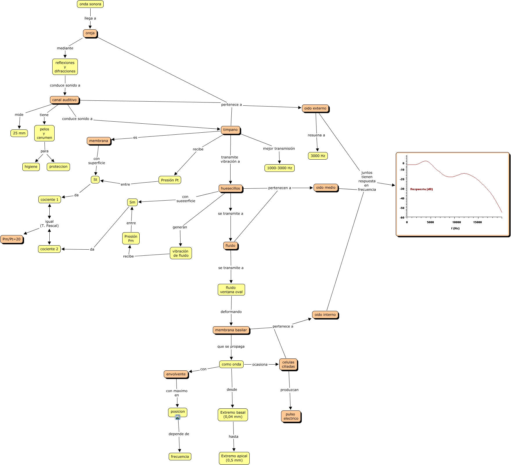 This Concept Map, created with IHMC CmapTools, has information related to: MAPA C oído, Presión Pt entre St, fluido se transmite a fluido ventana oval, oido medio juntos tienen respuesta en frecuencia, timpano recibe Presión Pt, como onda desde Extremo basal (0,04 mm), oreja mediante reflexiones y difracciones, membrana basilar que se propaga como onda, cociente 1 igual (T. Pascal) Pm/Pt=20, posicion depende de frecuencia, cociente 1 igual (T. Pascal) cociente 2, St da cociente 1, fluido pertenecen a oido medio, vibración de fluido recibe Presión Pm, reflexiones y difracciones conduce sonido a canal auditivo, canal auditivo conduce sonido a timpano, huesecillos generan vibración de fluido, como onda con envolvente, oido externo resuena a 3000 Hz, onda sonora llega a oreja, celulas ciliadas pertenece a oido interno