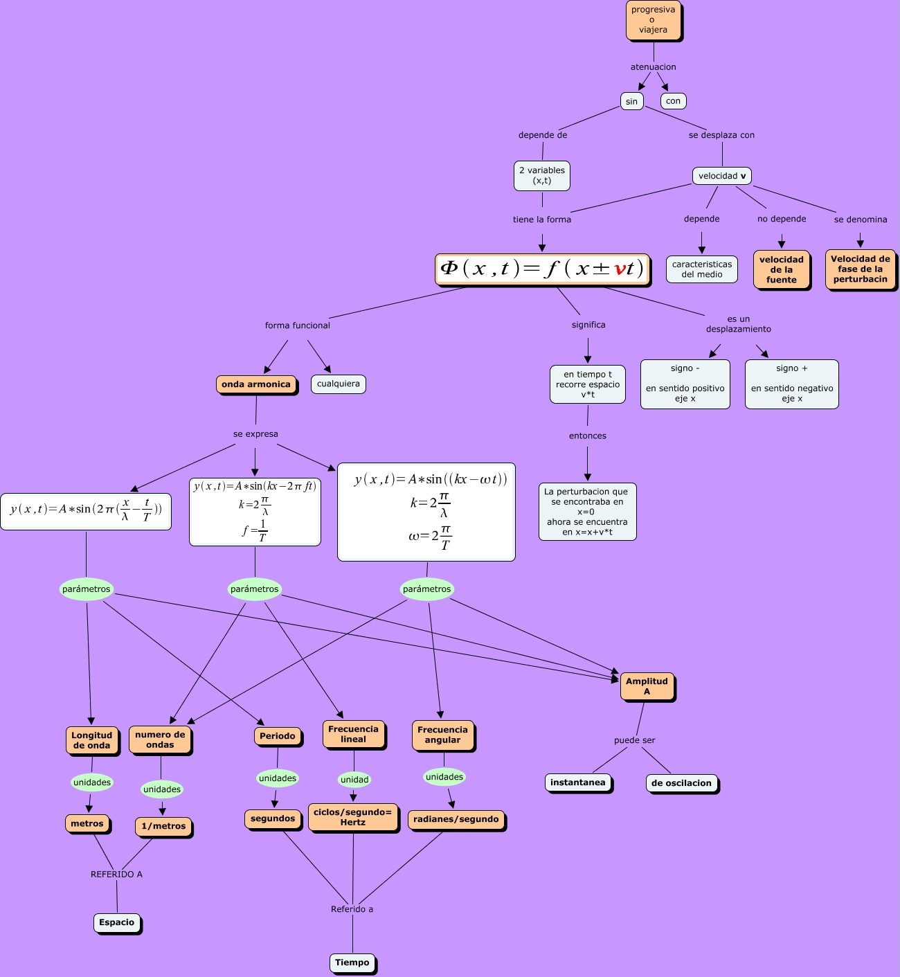 This Concept Map, created with IHMC CmapTools, has information related to: MAPA A ONDA_ARMÓNICA, onda armonica se expresa, es un desplazamiento signo + en sentido negativo eje x, Amplitud A puede ser instantanea, onda armonica se expresa, en tiempo t recorre espacio v*t entonces La perturbacion que se encontraba en x=0 ahora se encuentra en x=x+v*t, 2 variables (x,t) tiene la forma, ciclos/segundo= Hertz Referido a Tiempo, parámetros Amplitud A, velocidad v tiene la forma, parámetros Amplitud A, 1/metros REFERIDO A Espacio, significa en tiempo t recorre espacio v*t, parámetros Amplitud A, numero de ondas unidades 1/metros, forma funcional onda armonica, velocidad v no depende velocidad de la fuente, segundos Referido a Tiempo, forma funcional cualquiera, sin se desplaza con velocidad v, parámetros Periodo