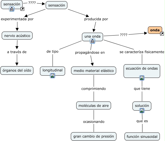This Concept Map, created with IHMC CmapTools, has information related to: MAPA 3 sonido_sensación, una onda ???? onda, una onda de tipo longitudinal, nervio acústico a través de órganos del oído, una onda se caracteríza fisicamente ecuación de ondas, sensación producida por una onda, una onda propagándose en medio material elástico, sensación experimentada por nervio acústico, moléculas de aire ocasionando gran cambio de presión, ecuación de ondas que tiene solución, medio material elástico comprimiendo moléculas de aire, solución que es función sinusoidal, sensación ???? sensación