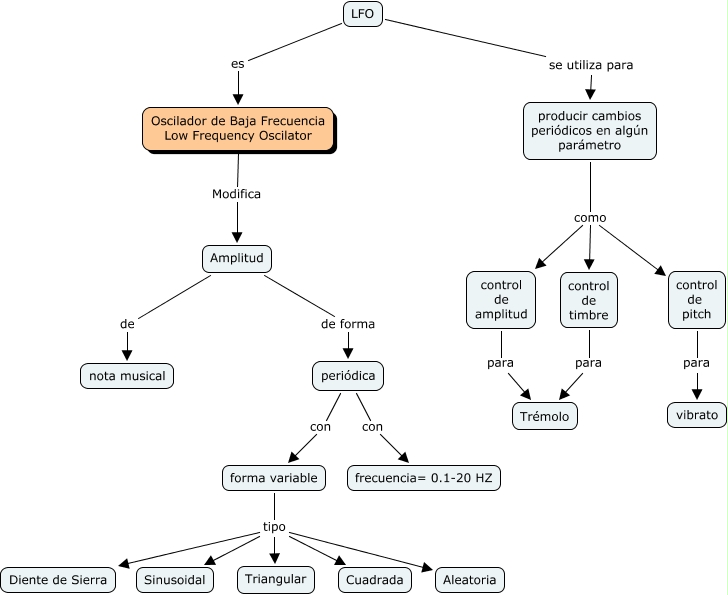 This Concept Map, created with IHMC CmapTools, has information related to: MAPA 2B 3 - LFO, LFO se utiliza para producir cambios periódicos en algún parámetro, forma variable tipo Diente de Sierra, producir cambios periódicos en algún parámetro como control de amplitud, periódica con frecuencia= 0.1-20 HZ, producir cambios periódicos en algún parámetro como control de pitch, forma variable tipo Sinusoidal, control de pitch para vibrato, LFO es Oscilador de Baja Frecuencia Low Frequency Oscilator, forma variable tipo Cuadrada, forma variable tipo Triangular, producir cambios periódicos en algún parámetro como control de timbre, Amplitud de nota musical, control de amplitud para Trémolo, periódica con forma variable, forma variable tipo Aleatoria, Oscilador de Baja Frecuencia Low Frequency Oscilator Modifica Amplitud, control de timbre para Trémolo, Amplitud de forma periódica