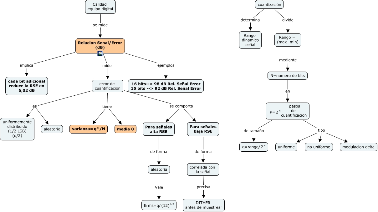 cuantificacion </mtext> </mrow> </math>, Relacion Senal/Error (dB) implica cada bit adicional reduce la RSE en 6,02 dB, error de cuantificacion es aleatorio, correlada con la señal precisa DITHER antes de muestrear, Para señales alta RSE de forma aleatoria, error de cuantificacion se comporta Para señales alta RSE, Relacion Senal/Error (dB) ejemplos 16 bits--> 98 dB Rel. Señal Error 15 bits --> 92 dB Rel. Señal Error, error de cuantificacion se comporta Para señales baja RSE, error de cuantificacion tiene media 0, <math xmlns="http://www.w3.org/1998/Math/MathML"> <mrow> <mtext> P= </mtext> <mmultiscripts> <mtext> 2 </mtext> <none/> <mtext> N </mtext> </mmultiscripts> <mtext> pasos