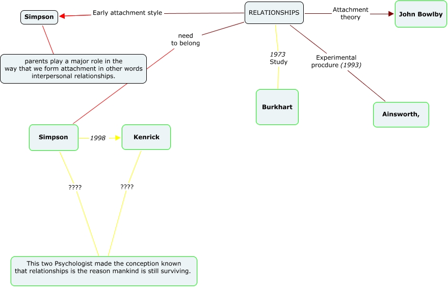 This Concept Map, created with IHMC CmapTools, has information related to: Relationships, RELATIONSHIPS 1973 Study Burkhart, RELATIONSHIPS Experimental procdure (1993) Ainsworth,, RELATIONSHIPS Early attachment style Simpson, Simpson ???? This two Psychologist made the conception known that relationships is the reason mankind is still surviving., Kenrick ???? This two Psychologist made the conception known that relationships is the reason mankind is still surviving., RELATIONSHIPS Attachment theory John Bowlby, RELATIONSHIPS need to belong Simpson, Simpson ???? parents play a major role in the way that we form attachment in other words interpersonal relationships., Simpson 1998 Kenrick, RELATIONSHIPS Early attachment style Simpson