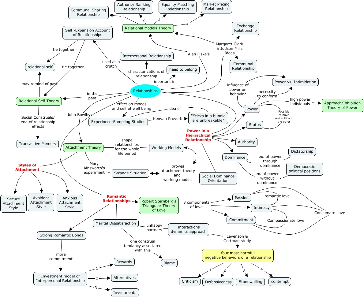 This Concept Map, created with IHMC CmapTools, has information related to: Relationship Chapter 4, Commitment Consumate Love Intimacy, Robert Sternberg's Triangular Theory of Love 3 components of love Intimacy, Robert Sternberg's Triangular Theory of Love 3 components of love Passion, Relationships in the past Relational Self Theory, Experinece-Sampling Studies idea of "Sticks in a bundle are unbreakable", Passion romantic love Intimacy, Dominance ex. of power without dominance Democratic political positions, Marital Dissatisfaction one construal tendancy associated with this Blame, Self -Expansion Account of Relationships tie together relational self, Self -Expansion Account of Relationships tie together Relational Self Theory, Relationships charactarizations of relationship Interpersonal Relationship, Relationships Power in a Hierarchical Relationship Dominance, Investment model of Interpersonal Relationship 1 Rewards, Robert Sternberg's Triangular Theory of Love 3 components of love Commitment, Intimacy Compassionate love Commitment, Attachment Theory Styles of Attachment Secure Attachment Style, Power necessity to conform Power vs. Intimidation, Relationships effect on moods and self of well being Experinece-Sampling Studies, Power Possible to have one with out the other Status, Relationships Romantic Relationships Marital Dissatisfaction