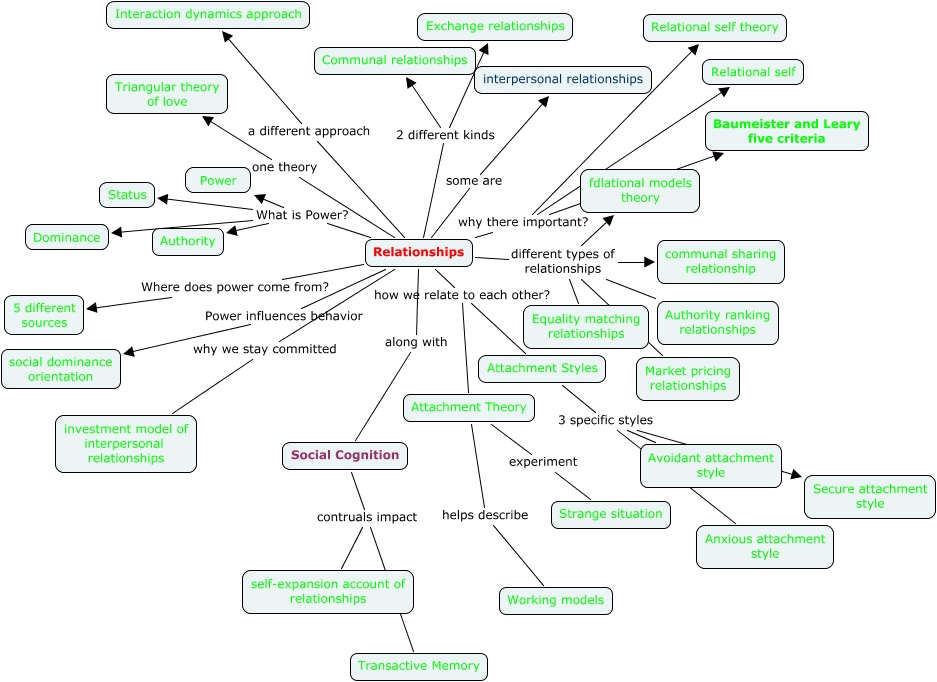 This Concept Map, created with IHMC CmapTools, has information related to: Relationships, Relationships some are interpersonal relationships, Social Cognition contruals impact self-expansion account of relationships, Relationships why there important? Relational self theory, Relationships Where does power come from? 5 different sources, Relationships What is Power? Power, Relationships different types of relationships Authority ranking relationships, Relationships how we relate to each other? Attachment Styles, Relationships different types of relationships Equality matching relationships, Relationships different types of relationships communal sharing relationship, Relationships 2 different kinds Communal relationships, Relationships What is Power? Status, Attachment Styles 3 specific styles Secure attachment style, Relationships a different approach Interaction dynamics approach, Relationships different types of relationships Market pricing relationships, Relationships 2 different kinds Exchange relationships, Relationships one theory Triangular theory of love, Relationships different types of relationships fdlational models theory, Relationships why there important? Baumeister and Leary five criteria, Attachment Styles 3 specific styles Anxious attachment style, Relationships What is Power? Authority