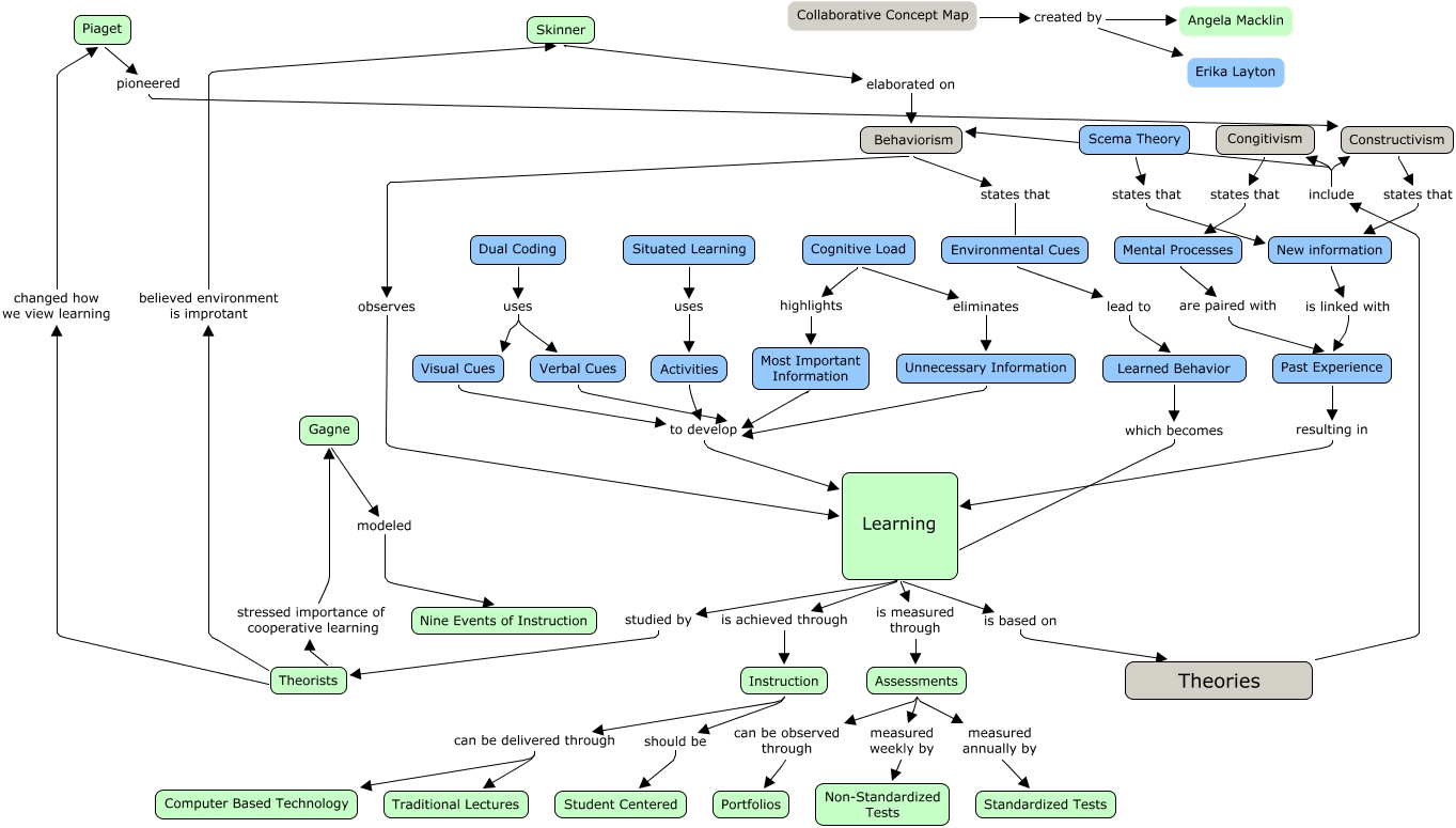 This Concept Map, created with IHMC CmapTools, has information related to: Individual Concept Map-Layton, Learned Behavior which becomes Learning, Learning studied by Theorists, Theorists changed how we view learning Piaget, Theories include Constructivism, Instruction can be delivered through Computer Based Technology, Assessments measured annually by Standardized Tests, Past Experience resulting in Learning, Activities to develop Learning, Skinner elaborated on Behaviorism, Cognitive Load highlights Most Important Information, Environmental Cues lead to Learned Behavior, Gagne modeled Nine Events of Instruction, Situated Learning uses Activities, Learning is achieved through Instruction, Theories include Behaviorism, Dual Coding uses Verbal Cues, Instruction should be Student Centered, Instruction can be delivered through Traditional Lectures, Theories include Congitivism, Behaviorism states that Environmental Cues