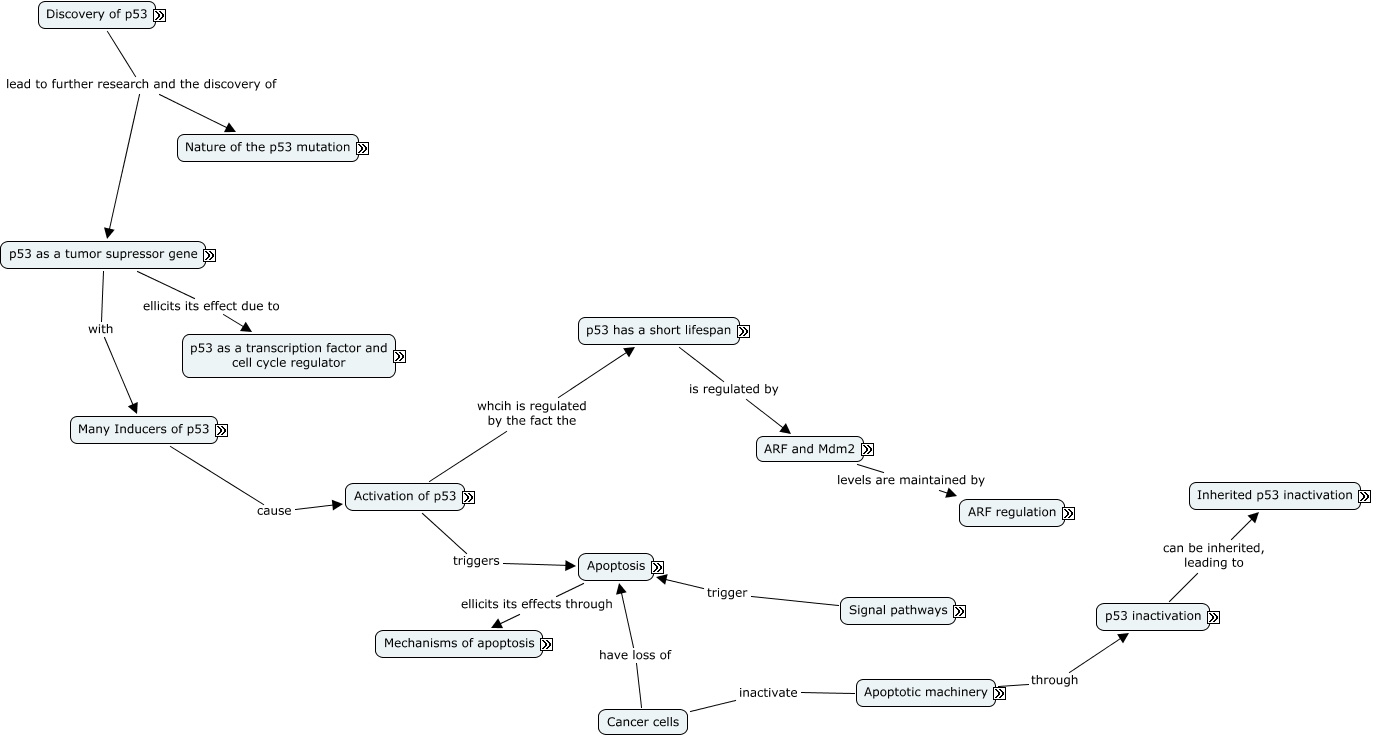 This Concept Map, created with IHMC CmapTools, has information related to: Chapter 9 Merged Map, p53 triggered apoptosis is used only in Nonroutine, emergency situations, Bax gene inactivation as described as Chapter 12, anti-apoptotic stategies e.g. PI3K --> Akt/PKB pathway, p53 is an example of A dominant mutant, cell death may be carried out by necrosis, Cancer cells have loss of Apoptosis, Myc as described in Section 9.8, Inherited p53 inactivation is mimicked in individuals born lacking Chk2 kinase, immune system using natural killer (NK) cells, executioner caspases cleave death substrates, Tumors including Brain tumors, p53 inducers include Agents that disrupt microtubule components of the cytoskeleton, inhibitors of apoptosis (IAPs) which are anti-apoptotic, p53 inactivation allows for the continued existence of an Oncogene bearing cell, p53 inducers include myc oncogene, inhibitors of apoptosis (IAPs) which are anti-apoptotic, ARF binds and inactivated Mdm2, phosphorlated p53 is not bound by Mdm2, p53 originally believed to be an Oncogene, Tumors including Breast cancer