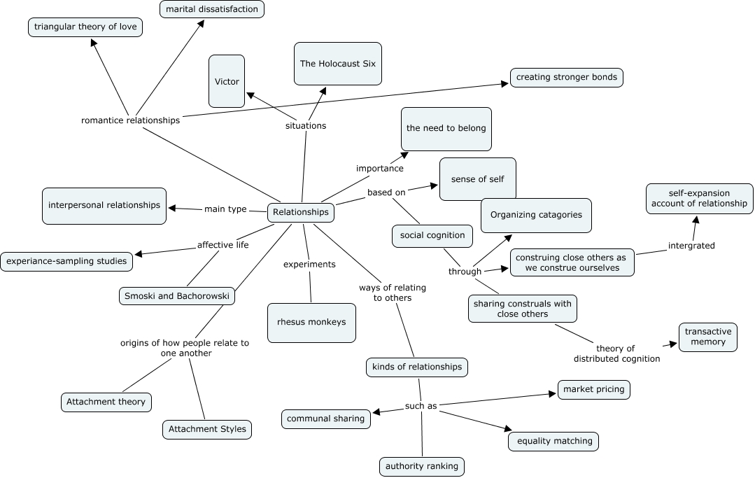 This Concept Map, created with IHMC CmapTools, has information related to: relationships, Relationships origins of how people relate to one another Attachment Styles, kinds of relationships such as equality matching, Relationships romantice relationships creating stronger bonds, kinds of relationships such as market pricing, Relationships romantice relationships marital dissatisfaction, Relationships importance the need to belong, social cognition through Organizing catagories, Relationships situations Victor, Relationships based on sense of self, social cognition through construing close others as we construe ourselves, Relationships situations The Holocaust Six, Relationships based on social cognition, Relationships origins of how people relate to one another Attachment theory, sharing construals with close others theory of distributed cognition transactive memory, Relationships romantice relationships triangular theory of love, social cognition through sharing construals with close others, Relationships affective life Smoski and Bachorowski, Relationships affective life experiance-sampling studies, kinds of relationships such as communal sharing, construing close others as we construe ourselves intergrated self-expansion account of relationship