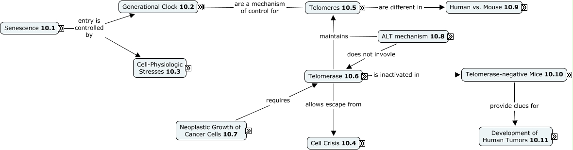 This Concept Map, created with IHMC CmapTools, has information related to: 10 merged, senescence can be postponed by expressing hTERT, sequence exchange between telomeres aka copy choice mechanism (fig 10.30), detectable in 85-90%, Humans requires introduction of SV40 large T oncogene, Crisis results in Apoptosis, Cell-Lineage is studied using Caenorhabditus Elegans, Generational Clock could cause cells to enter Crisis, cancer cells can avoid crisis, holoenzyme consisting of several subunits including hTERT, Tumor Supressor Genes block Senesence, crisis aka loss of neoplastic growth program (fig 10.27), Overhang is found in a configuration termed T-Loop, Clonal is duscussed in Section 2.5, ALT mechanism 10.8 maintains Telomeres 10.5, telomerase allows for regeneration, Tumors contain cells which undergo Apoptosis, Cancer Cells depend on other Cell Types, Laboratory mice with inactivation of mTR, Cell-Physiologic Stresses limit Replication, Senescence 10.1 entry is controlled by Generational Clock 10.2