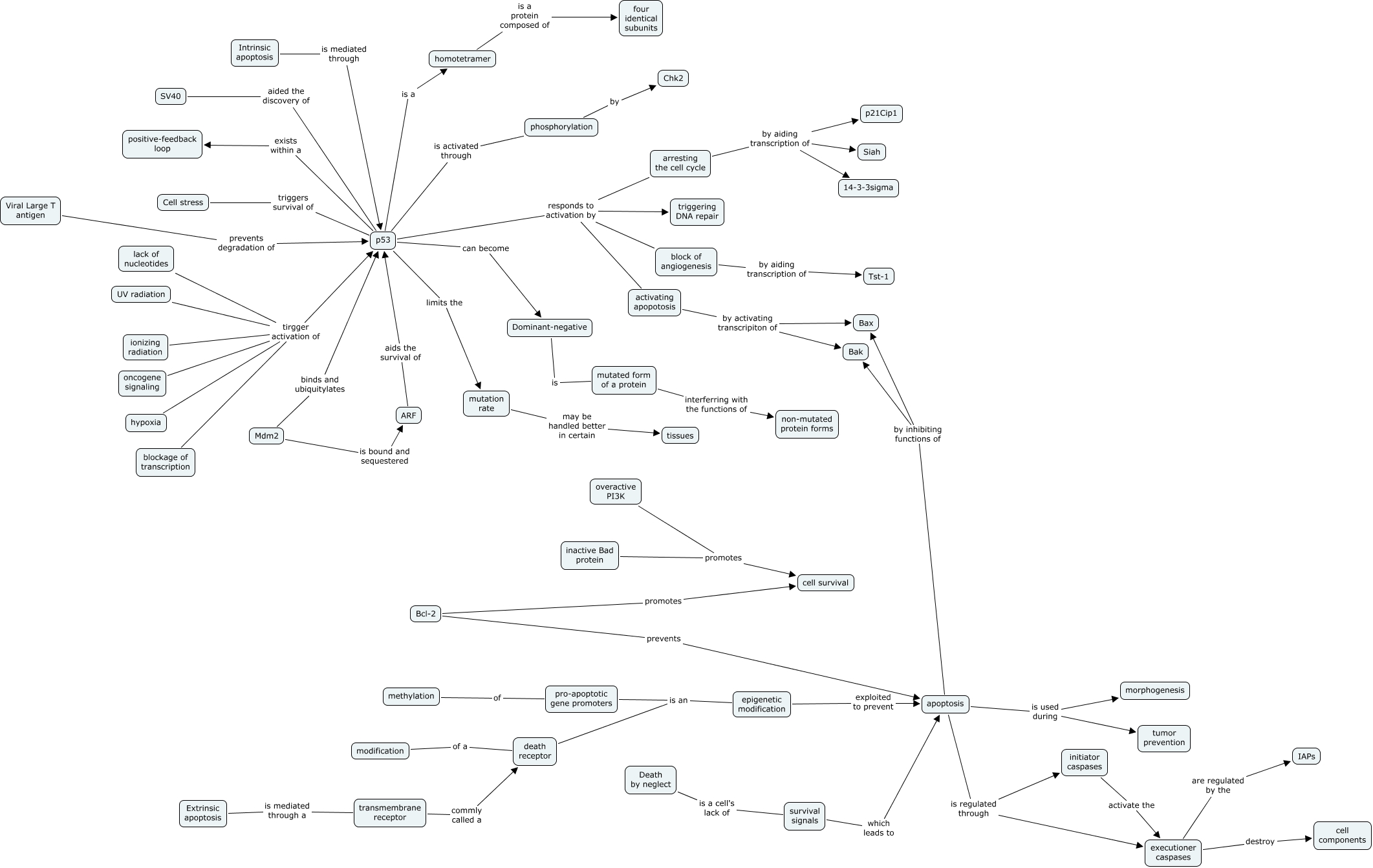This Concept Map, created with IHMC CmapTools, has information related to: class discussion 10.9 and 10.12.07, Dominant-negative is mutated form of a protein, apoptosis is regulated through initiator caspases, activating apopotosis by activating transcripiton of Bak, overactive PI3K promotes cell survival, oncogene signaling tirgger activation of p53, block of angiogenesis by aiding transcription of Tst-1, initiator caspases activate the executioner caspases, pro-apoptotic gene promoters is an epigenetic modification, Death by neglect is a cell's lack of survival signals, survival signals which leads to apoptosis, apoptosis is used during morphogenesis, epigenetic modification exploited to prevent apoptosis, apoptosis is regulated through executioner caspases, phosphorylation by Chk2, transmembrane receptor commly called a death receptor, lack of nucleotides tirgger activation of p53, Mdm2 binds and ubiquitylates p53, p53 can become Dominant-negative, p53 exists within a positive-feedback loop, executioner caspases destroy cell components