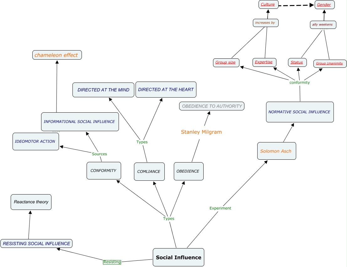 This Concept Map, created with IHMC CmapTools, has information related to: Ch 6 Social Influence, COMLIANCE Types DIRECTED AT THE HEART, OBEDIENCE Stanley Milgram OBEDIENCE TO AUTHORITY, NORMATIVE SOCIAL INFLUENCE conformity Status, Social Influence Resisting RESISTING SOCIAL INFLUENCE, Social Influence Types OBEDIENCE, RESISTING SOCIAL INFLUENCE ???? Reactance theory, Social Influence Types COMLIANCE, CONFORMITY Sources IDEOMOTOR ACTION, NORMATIVE SOCIAL INFLUENCE conformity Group size, COMLIANCE Types DIRECTED AT THE MIND, INFORMATIONAL SOCIAL INFLUENCE ???? chameleon effect, Expertise ???? Culture, Status ???? Gender, NORMATIVE SOCIAL INFLUENCE conformity Group Unanimity, Group Unanimity ???? Gender, Social Influence Types CONFORMITY, CONFORMITY Sources INFORMATIONAL SOCIAL INFLUENCE, NORMATIVE SOCIAL INFLUENCE conformity Expertise, Culture ???? Gender, Social Influence Experiment Solomon Asch
