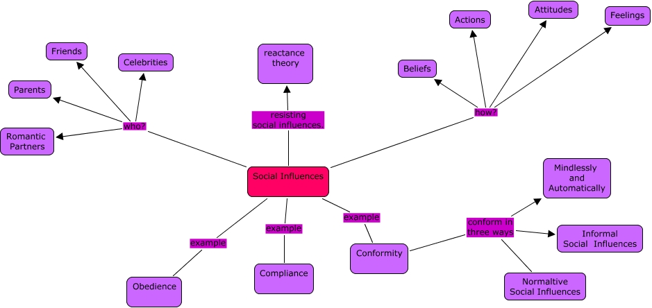 This Concept Map, created with IHMC CmapTools, has information related to: Social Influences, Social Influences how? Beliefs, Social Influences how? Actions, Conformity conform in three ways Normaltive Social Influences, Social Influences example Obedience, Social Influences who? Celebrities, Social Influences how? Feelings, Social Influences example Conformity, Conformity conform in three ways Informal Social Influences, Social Influences who? Parents, Social Influences who? Friends, Social Influences resisting social influences. reactance theory, Conformity conform in three ways Mindlessly and Automatically, Social Influences example Compliance, Social Influences how? Attitudes, Social Influences who? Romantic Partners