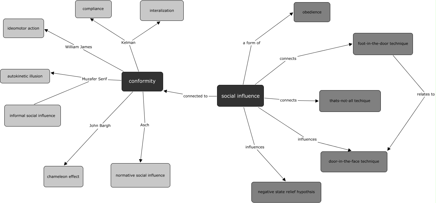 This Concept Map, created with IHMC CmapTools, has information related to: Untitled 1, social influence influences negative state relief hypothsis, social influence connects foot-in-the-door technique, social influence influences door-in-the-face technique, foot-in-the-door technique relates to door-in-the-face technique, conformity William James ideomotor action, social influence connects thats-not-all techique, conformity Kelman compliance, social influence connected to conformity, conformity Muzafer Serif informal social influence, conformity Muzafer Serif autokinetic illusion, social influence a form of obedience, conformity Asch normative social influence, conformity Kelman interalization, conformity John Bargh chameleon effect