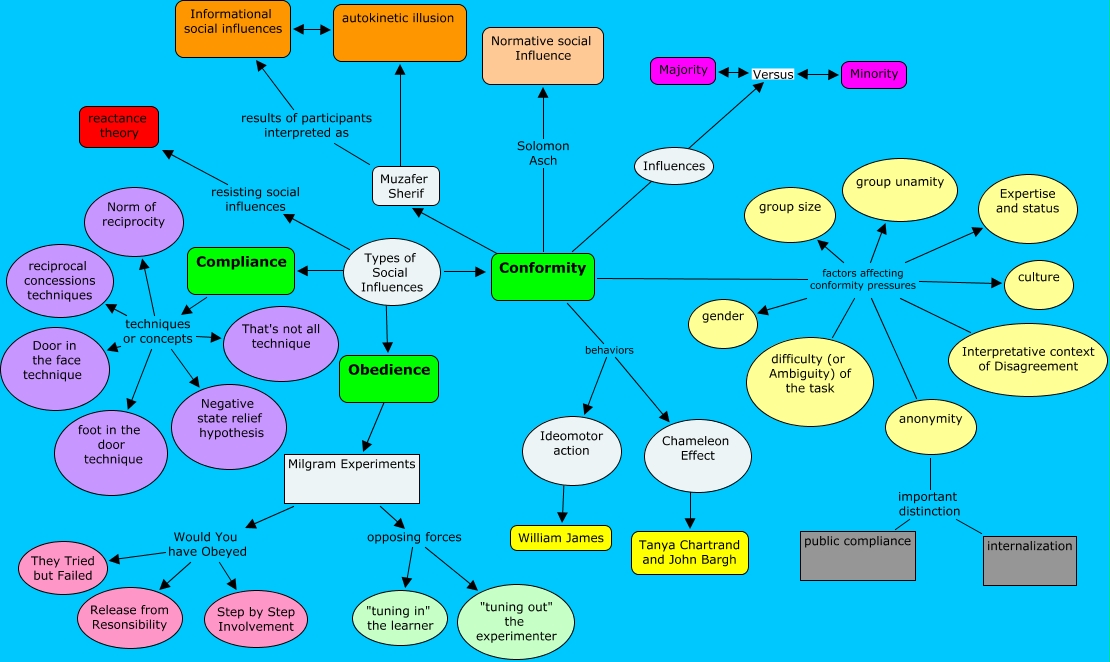 This Concept Map, created with IHMC CmapTools, has information related to: Social Influences Ch. 6, Obedience ???? Milgram Experiments, Conformity factors affecting conformity pressures anonymity, Conformity factors affecting conformity pressures group unamity, Conformity ???? Muzafer Sherif, autokinetic illusion ???? Informational social influences, Chameleon Effect ???? Tanya Chartrand and John Bargh, anonymity important distinction internalization, Muzafer Sherif results of participants interpreted as Informational social influences, Milgram Experiments Would You have Obeyed Step by Step Involvement, Types of Social Influences ???? Conformity, Conformity Versus Minority, Conformity factors affecting conformity pressures group size, Milgram Experiments Would You have Obeyed They Tried but Failed, Conformity factors affecting conformity pressures Expertise and status, Conformity behaviors Chameleon Effect, Milgram Experiments Would You have Obeyed Release from Resonsibility, Compliance techniques or concepts Norm of reciprocity, Ideomotor action ???? William James, anonymity important distinction public compliance, Compliance techniques or concepts reciprocal concessions techniques