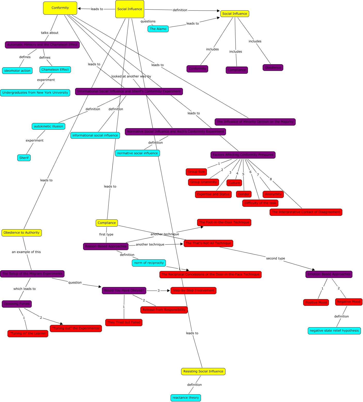 This Concept Map, created with IHMC CmapTools, has information related to: Social Influence, Reason-Based Approaches definition norm of reciprocity, The Alamo leads to Social Influence, Reason-Based Approaches another technique The Foot-in-the-Door Technique, autokinetic illusion experiment Sherif, Informational Social Influence and Sherif's Conformity Experiment definition autokinetic illusion, Would You Have Obeyed? 1 They Tried but Failed, Opposing Forces 1 "Tuning in" the Learner, The Setup of the Milgram Experiments which leads to Opposing Forces, Factors Affecting Conformity Pressures 1 Group Size, Factors Affecting Conformity Pressures 5 Gender, Social Influence includes Obedience, Opposing Forces 2 "Tuning out" the Experimenter, Factors Affecting Conformity Pressures 6 Difficulty of the task, Negative Mood definition negative state relief hypothesis, Obedience to Authority an example of this The Setup of the Milgram Experiments, Social Influence leads to Conformity, Resisting Social Influence definition reactance theory, Social Influence leads to Compliance, Emotion-Based Approaches 1 Positive Mood, Factors Affecting Conformity Pressures 7 Anonymity