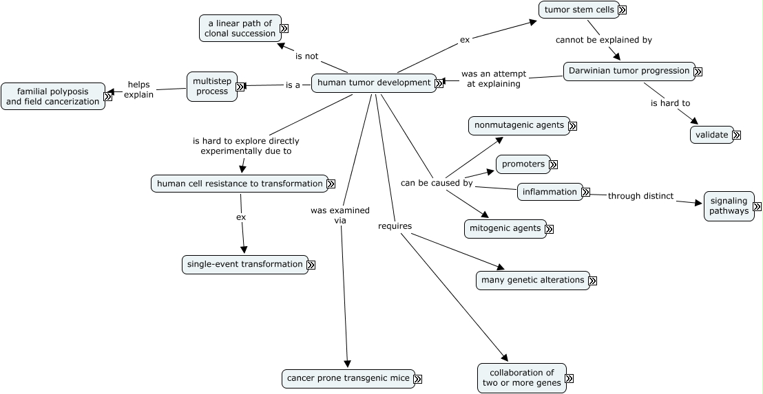 This Concept Map has information related to: Chapter Map, estrogen upreglates growth of mammary epithelial cells, nonmutagenic agents contribute to tumorigenesis, evidence reveal that normal cells, transformation requires 5 intracellular pathways, NF-kapaB pathway activates COX-2, validating Darwinian model of tumor development could be possible through identifying necessary epigenetic events, toxic agents ex distilled alcoholic drinks, initiators alter DNA, PKC-alpha indirectly leads to inflammation, intestinal epithelial tumors can be easily examined for through colonoscopy