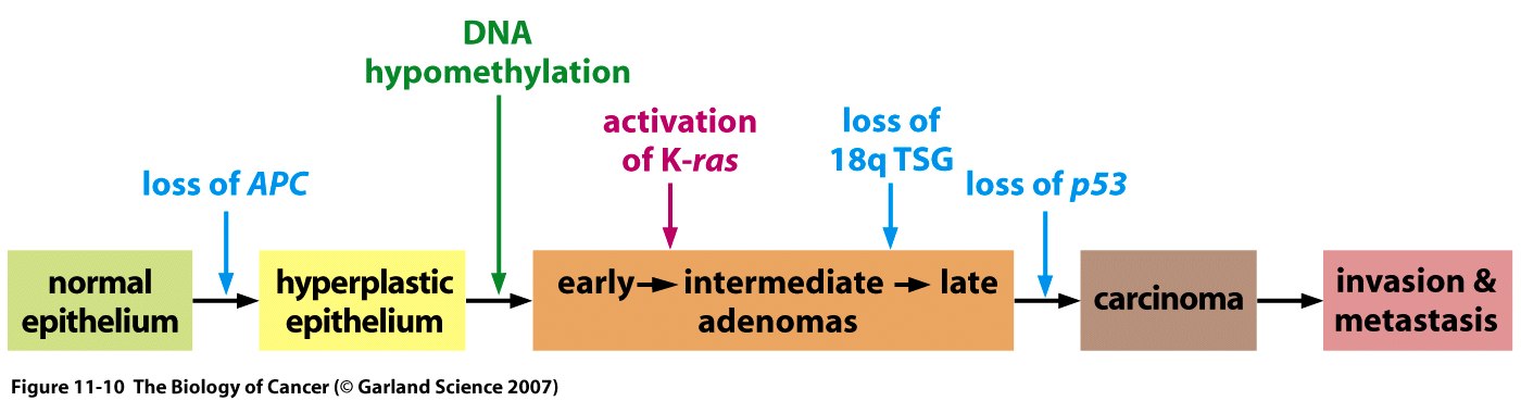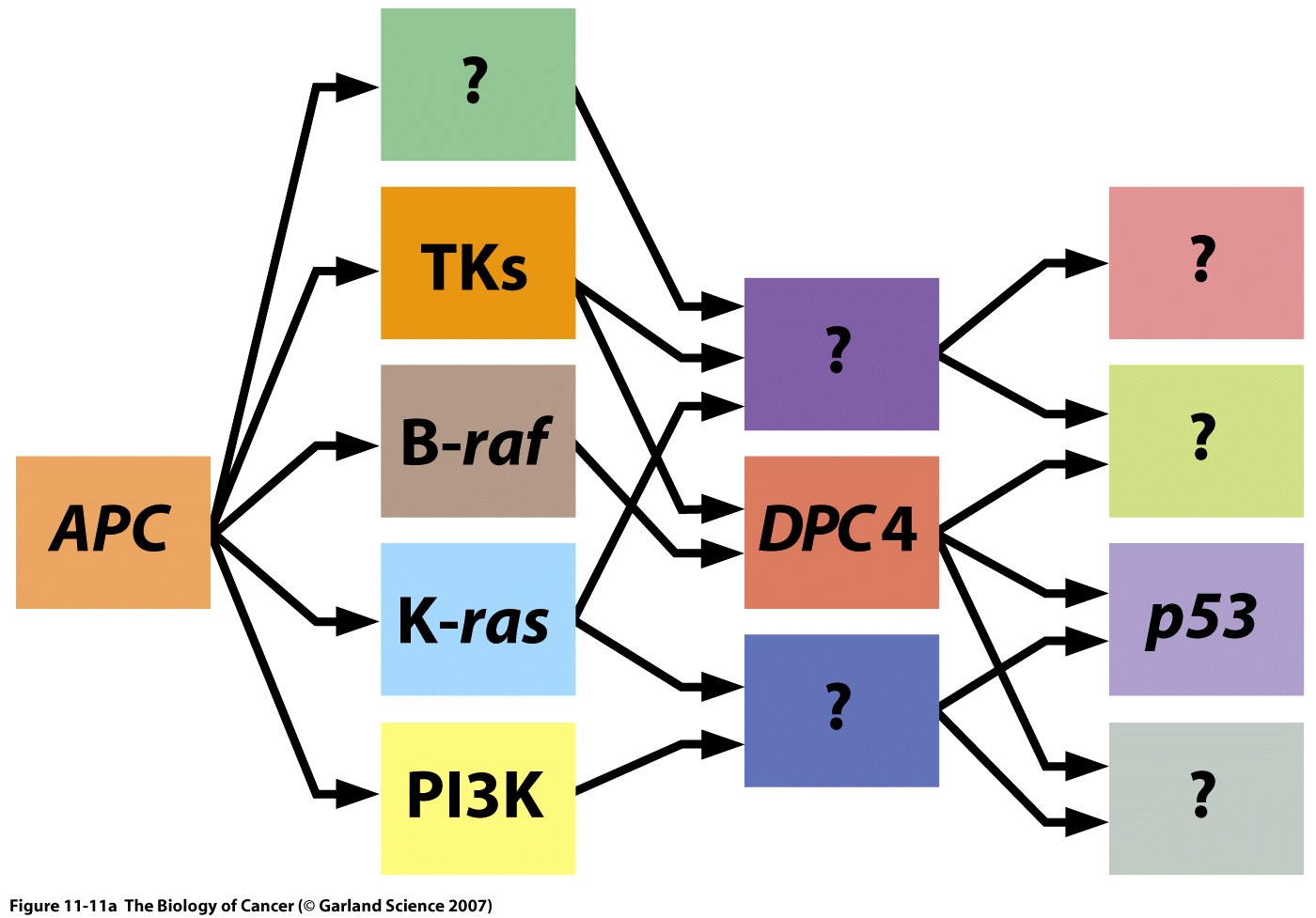 This Concept Map, created with IHMC CmapTools, has information related to: Section 11.3, APC loss causes trapping, APC loss occurs early in colonic growths, colonic crypts have a rapid cell death inducing organization, genetic alterations ex LOH, genetic alterations during tumor progression, colonic growths accumulate genetic alterations, colonic growths can take many genetic paths, tumor progression can take many genetic paths, LOH in various chromosomal arms, LOH of TSGs, Barrett's esophagus can take many genetic paths, trapping of cells in the colonic crypts